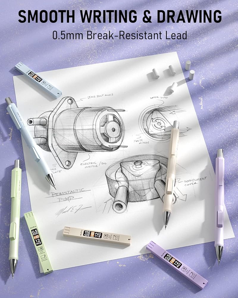 【دقة جيدة】: أقلام الرصاص الميكانيكية Nicpro مقاس 0.7 مم معروفة بتقدمها الدقيق، وهذه الدقة مفيدة بشكل خاص في الرسم الفني أو الصياغة أو أي مهمة تتطلب خطوطًا دقيقة ومفصلة.