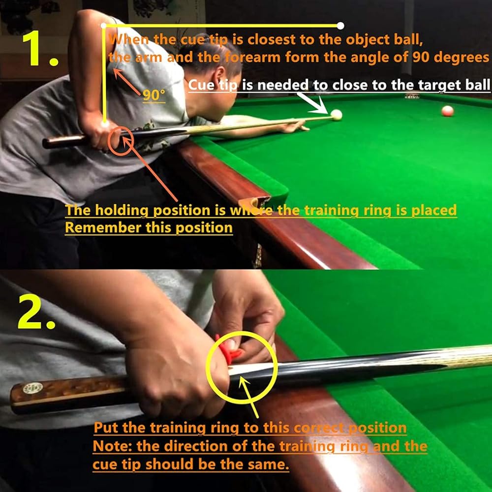 When the cue tip is closest to the object ball, the arm and the forearm form the angle of 90 degrees.And then the holding position is where the training ring is placed. After adjusted you can start training. To start the formal training, please correct the habit. The shot would be easier and more accurate than ever before.