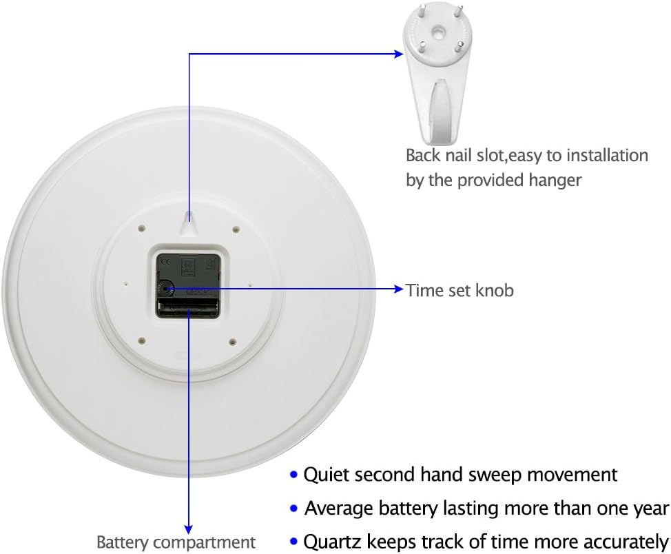• ساعة الحائط الصامتة تعمل ببطارية AA واحدة (غير متضمنة)، عمر بطارية طويل الأمد. ساعة حائط رائعة للديكور للمنزل ومكتبة المكتب والمطبخ والفصول الدراسية والمستشفى.