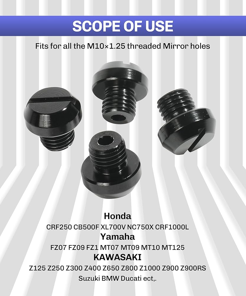 [Widely Applicable] Suitable for all M10x1.25 threaded mirror holes, such as CRF250 CB500F XL700V NC750X CRF1000L/FZ07 FZ09 FZ1 MT07 MT09 MT10 MT125/KAWASAKI Z125 Z250 Z300 Z400 Z650 Z800 Z1000 Z900 Z900RS, etc.