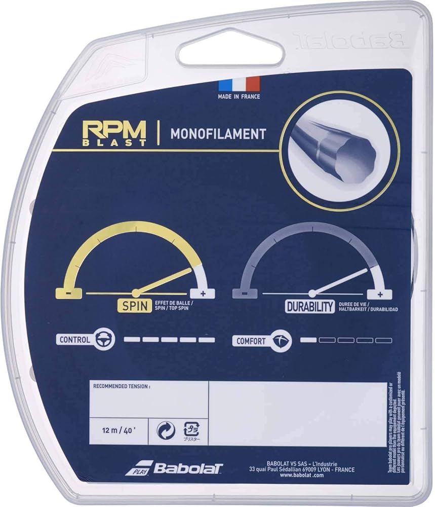 The Babolat RPM Blast is a monofilament string that offers an excellent combination of effects, power and a unique feeling on impact. Thanks to its bonded silicone coating, the potential it provides is surprising. This string is the perfect choice for the modern player with a style of play like Rafael Nadal, Jo-Wilfried Tsonga and Sam Stour. This version of 1.30 mm calibre is even more durable.