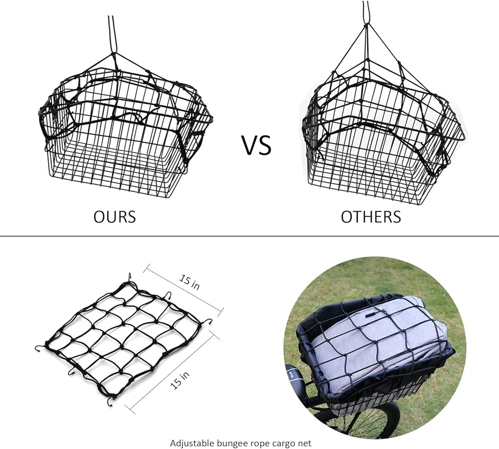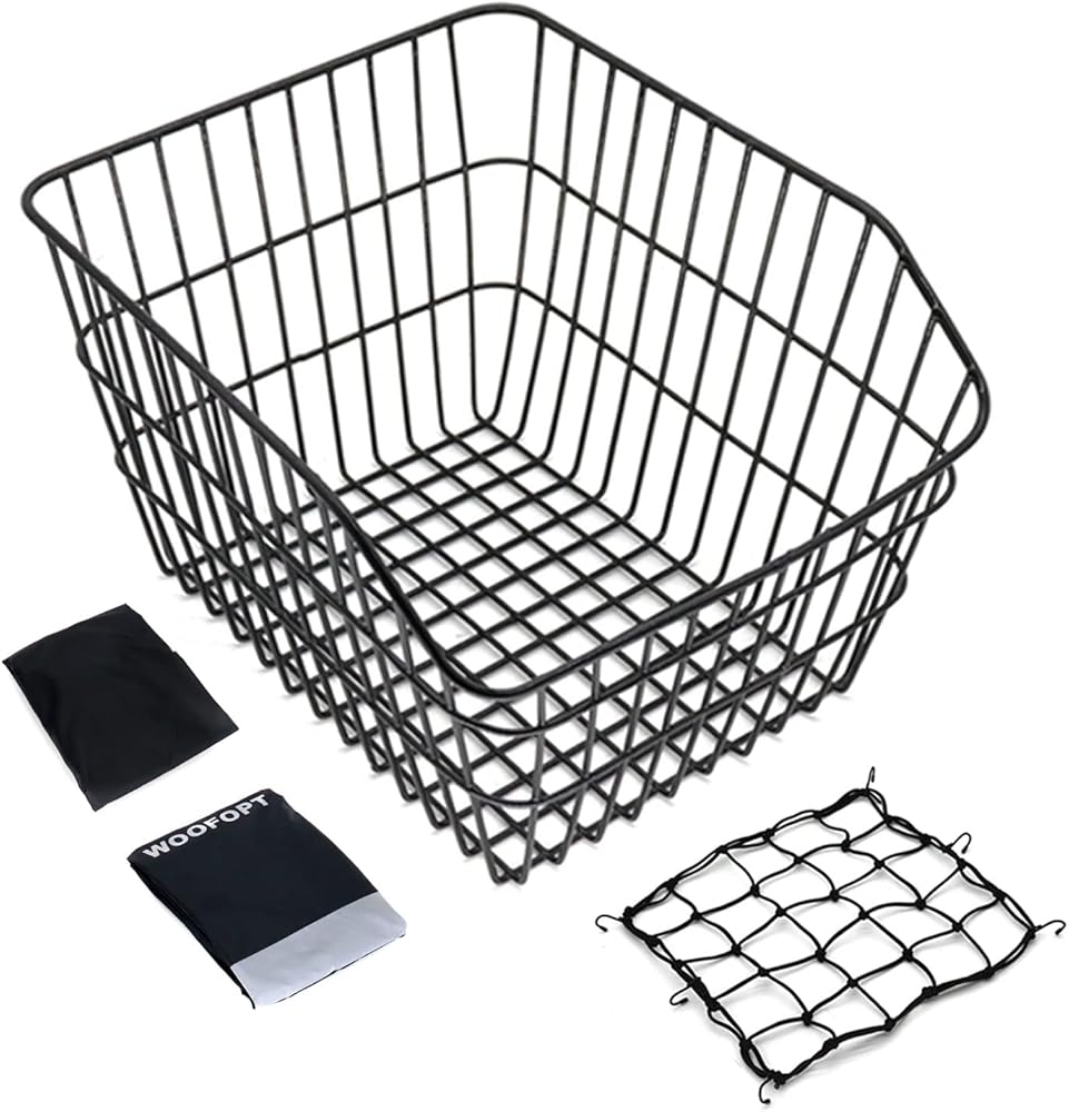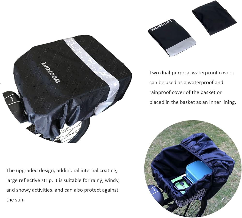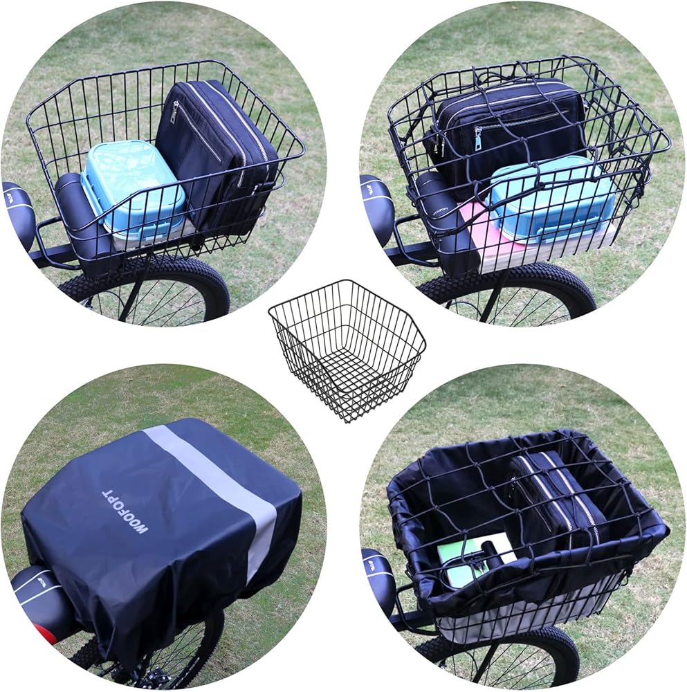 • 2 BICYCLE WATERPROOF BASKET COVERS/INNER LINING + ADJUSTABLE CARGO NET: Rear bike basket for bicycles comes with 2 waterproof covers, upgraded design, increase internal coating, reflective strips, tighten the rear bicycle basket,so there is no need to worry about small items falling.Bike rack basket is suitable for rainy, windy, and snowy activities. Rear basket for bike is also equipped with a cargo net as an additional reward.