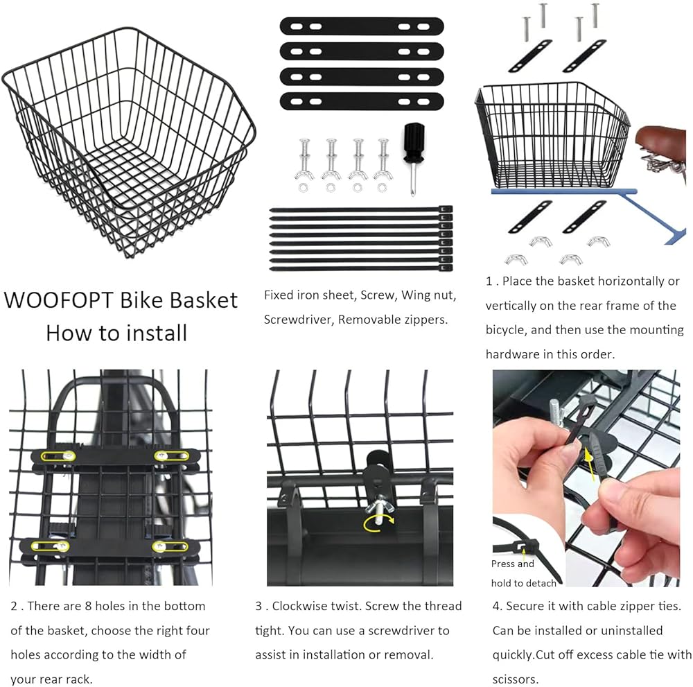• UNIVERSAL REAR BIKE BASKET: Wide bottom rear bike basket, sturdy, and easy to install and uninstall. 2 installation methods, screw kit with screwdriver and removable nylon cable ties. Back bike basket can be installed horizontally or vertically.