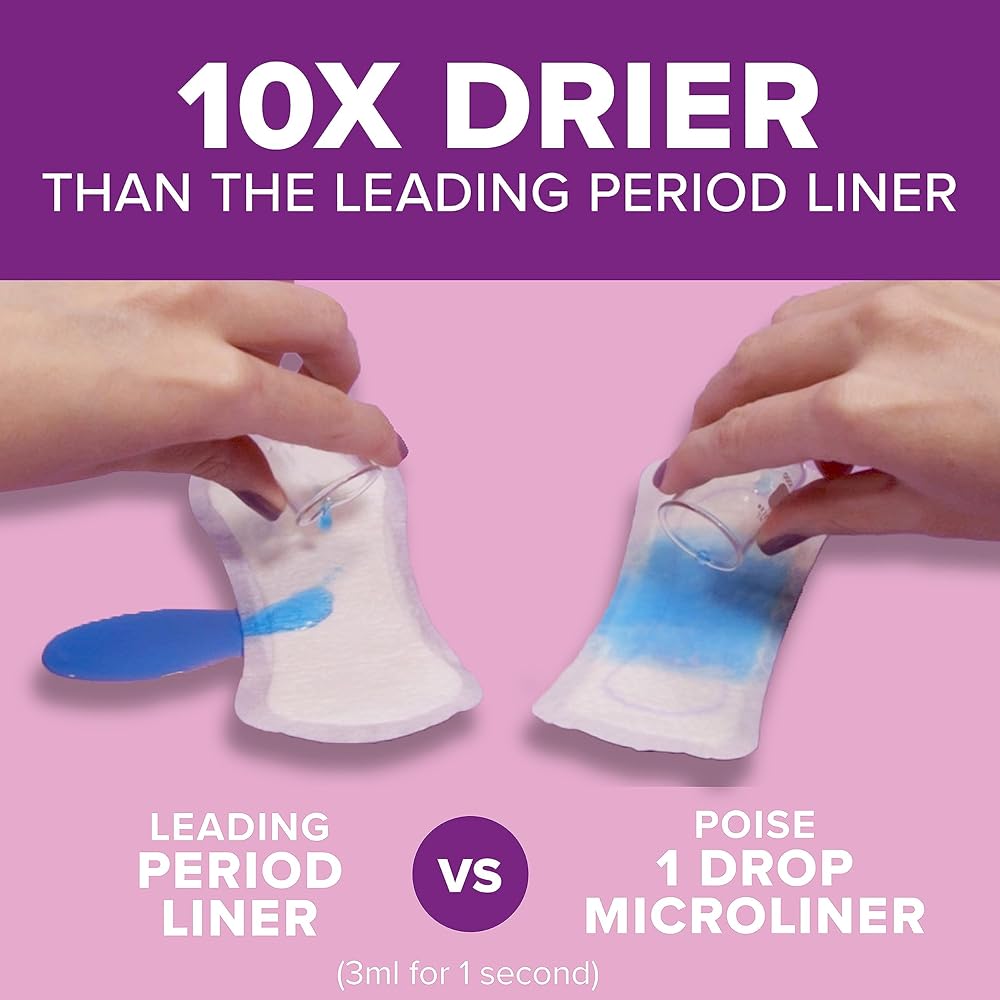 • Poise Daily Microliners: 50 postpartum incontinence panty liners, 1 drop lightest absorbency, long length (packaging may vary); HSA/FSA-eligible in the US