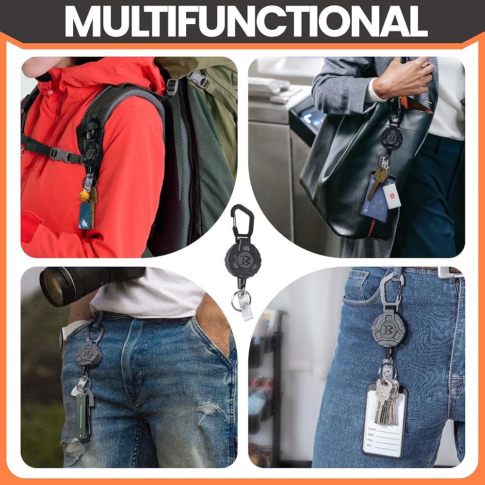 MULTIFUNCTIONAL: The heavy duty badge reel comes with a metal key ring and a PVC badge holder, which can be used as a backpack carabiner for outdoor sports. You can also hang badges, ID cards, keys and many other items.