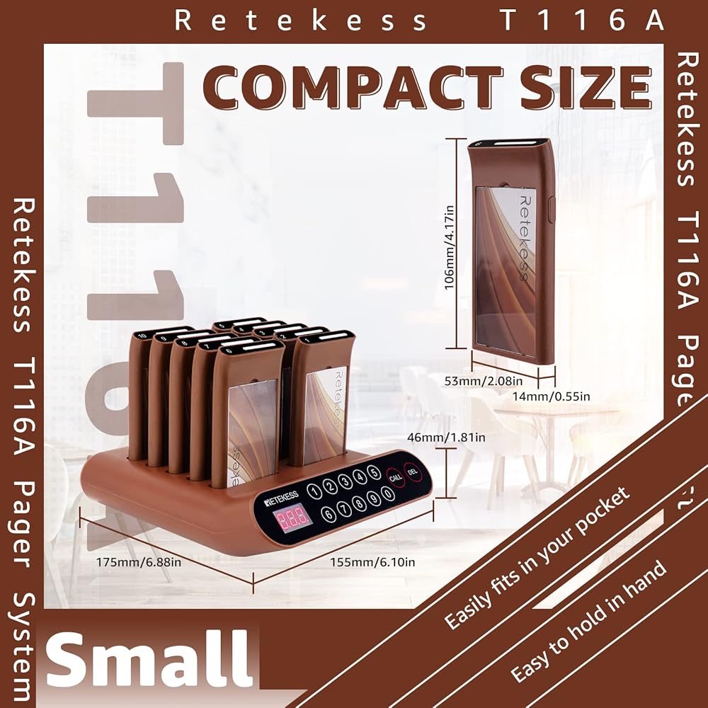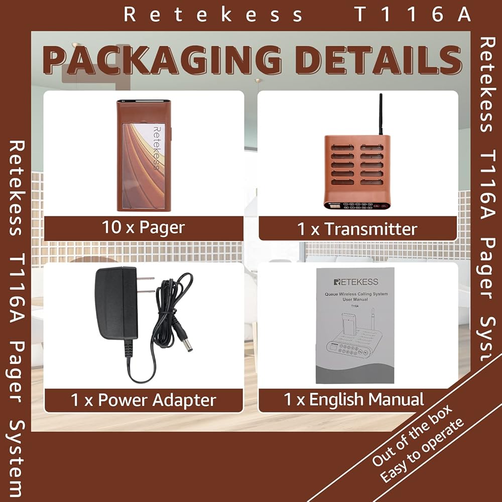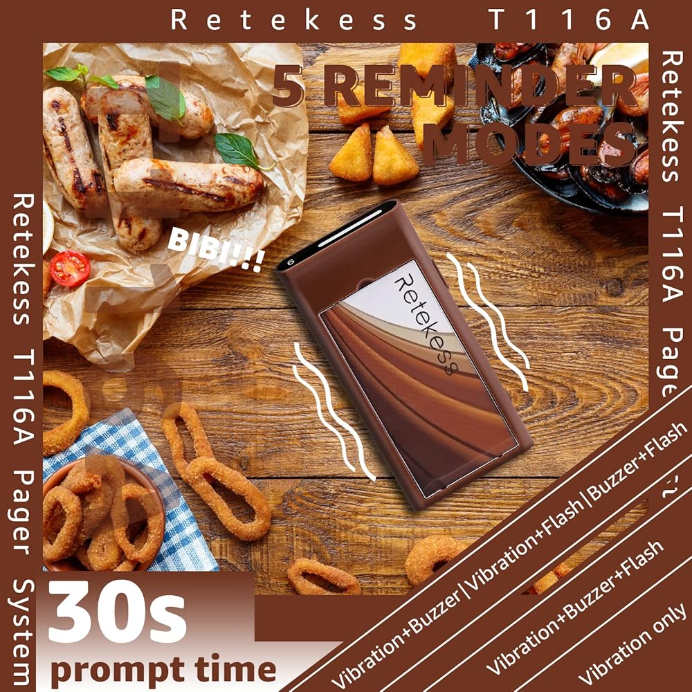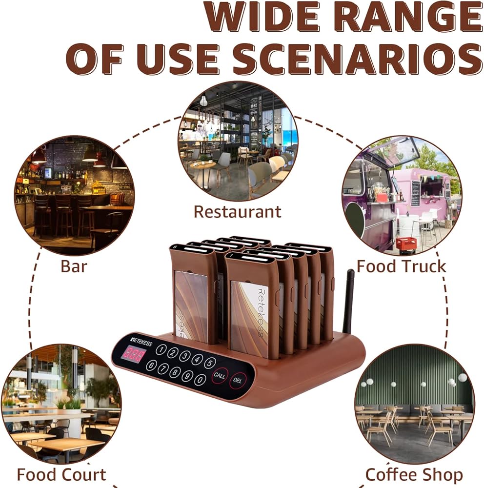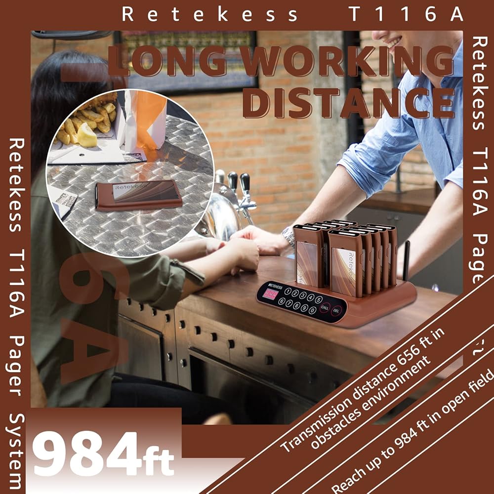 يمكن لجهاز النداء الخاص بالمطاعم Retekess T116A أن يخترق الجدران بشكل فعال؛ السقوف والأرضيات. تبلغ مسافة الإرسال حوالي 656 قدمًا في بيئة العوائق ويمكن أن تصل إلى 984 قدمًا في المجال المفتوح