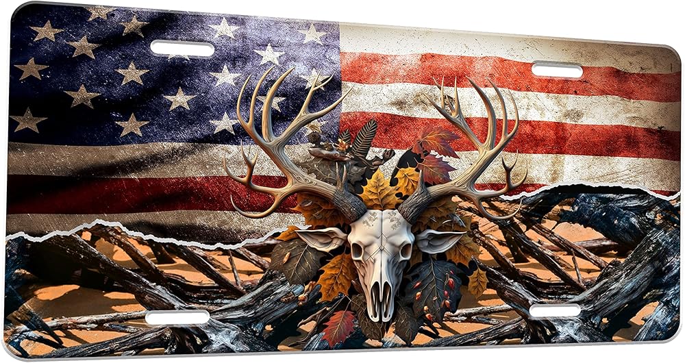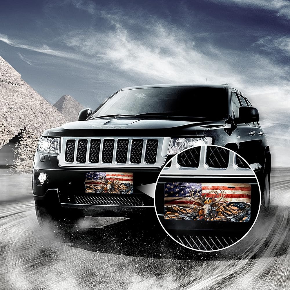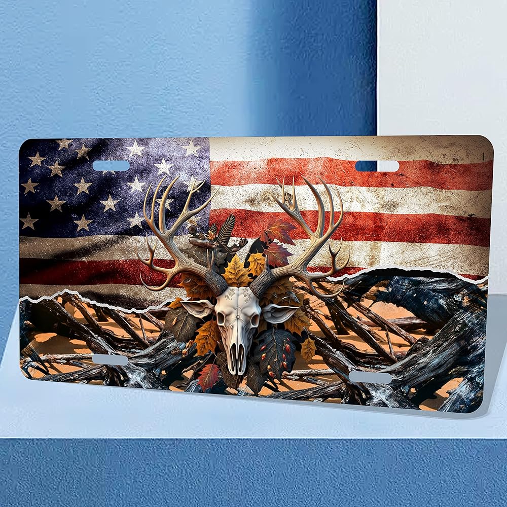 American Flag Deer Skull License Plate Funny Camo License Plate for Car Personalise Decoration Stainless Steel Vanity Tag License Plate Frame Fits Standard Us Holder 6.2" X12.2 for Women Men