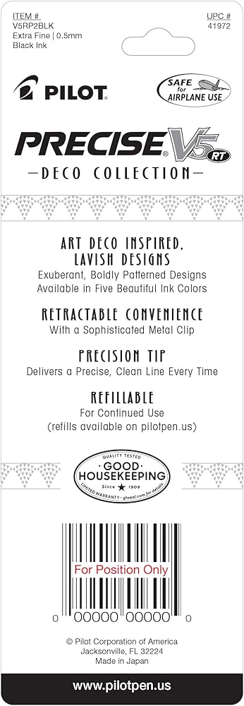 Pilot's Precise V5 RT Deco Collection brings bold design to the barrel of the classic smooth-writing Pilot Precise V5 rollerball pen. Always a favorite for it's consistent, flowing strokes and precise clean lines, the Precise looks better than ever. The V5 RT features retractable convenience with a sophisticated metal clip and incorporates an airplane safe system. Extra fine point, refillable with a variety of ink colors with Pilot refills 77273, 77274, 77278, 77279, 77280.