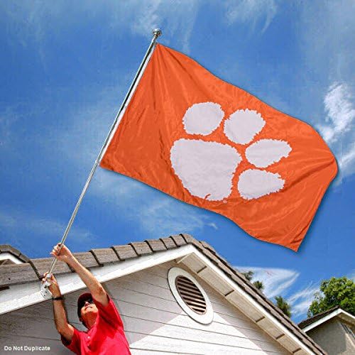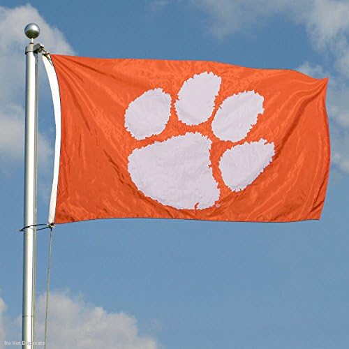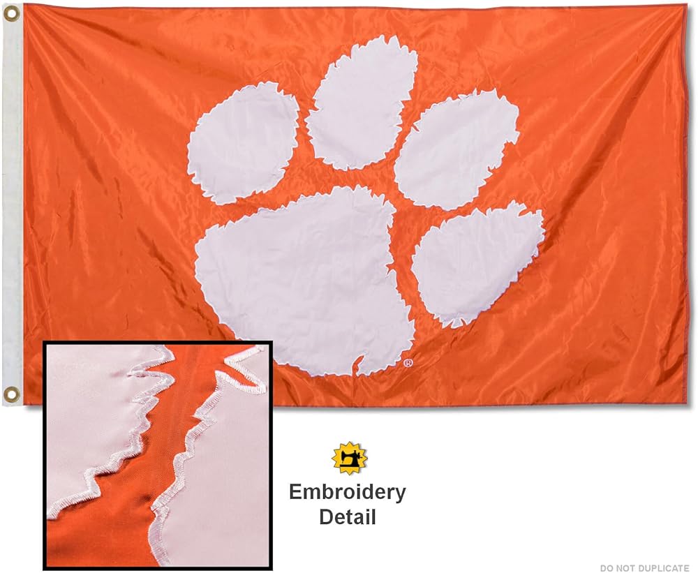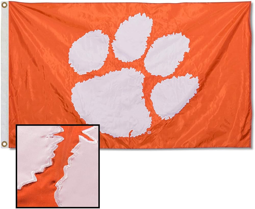 Our Flag, Banner or Pennant measures 3 ft x 5 ft in size, has Quadruple Stitched fly ends, is made of durable Nylon, and has two Metal Grommets for attaching to your flagpole. The Embroidered and Appliqued Clemson logos are applied via our 2-patch applique method, therefore, one patch is sewn on each side of the flag. These flags are Officially Licensed and College, University, or Team Approved and are Viewable from Both Sides (Opposite Side is a Reverse Image).