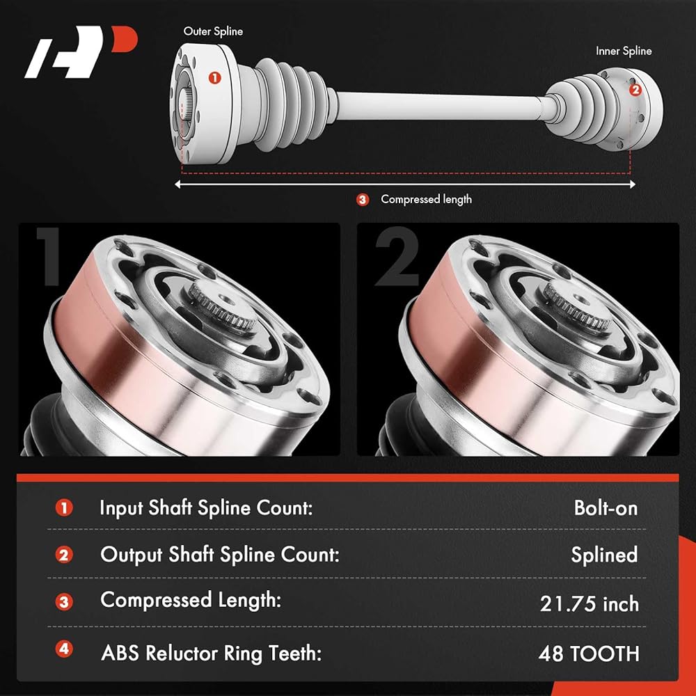[المواصفات]: ① الموقع: أمامي يسار ويمين (جانب السائق والراكب)؛ ② حلقة ABS متضمنة: نعم؛ ③ صامولة المحور متضمنة: نعم؛ ④ الطول المضغوط: 21.75 بوصة؛ ⑤ نمط اتصال عمود الإدخال: مثبت بمسمار؛ ⑥ نمط اتصال عمود الإخراج: محزوزة
