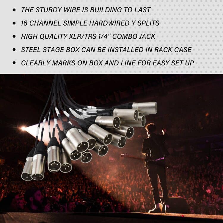 كابل مقسم الثعبان ذو 24 قناة: 24 قناة مختلفة XLR TRS 1/4 بوصة كابل ثعبان كومبو مع أداء صوتي احترافي. يحتوي على صندوقين مع موصلات ذكر، أحدهما بطول 15 قدمًا، والآخر بطول 30 قدمًا.