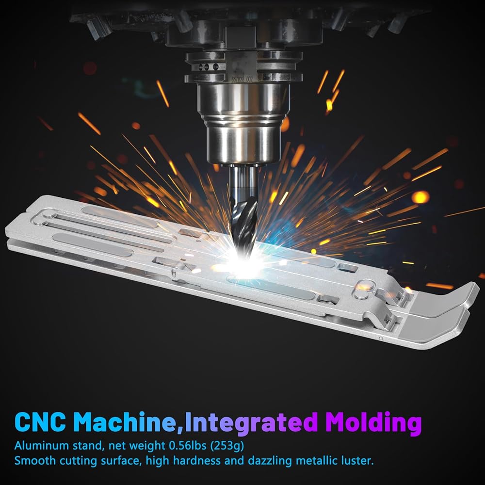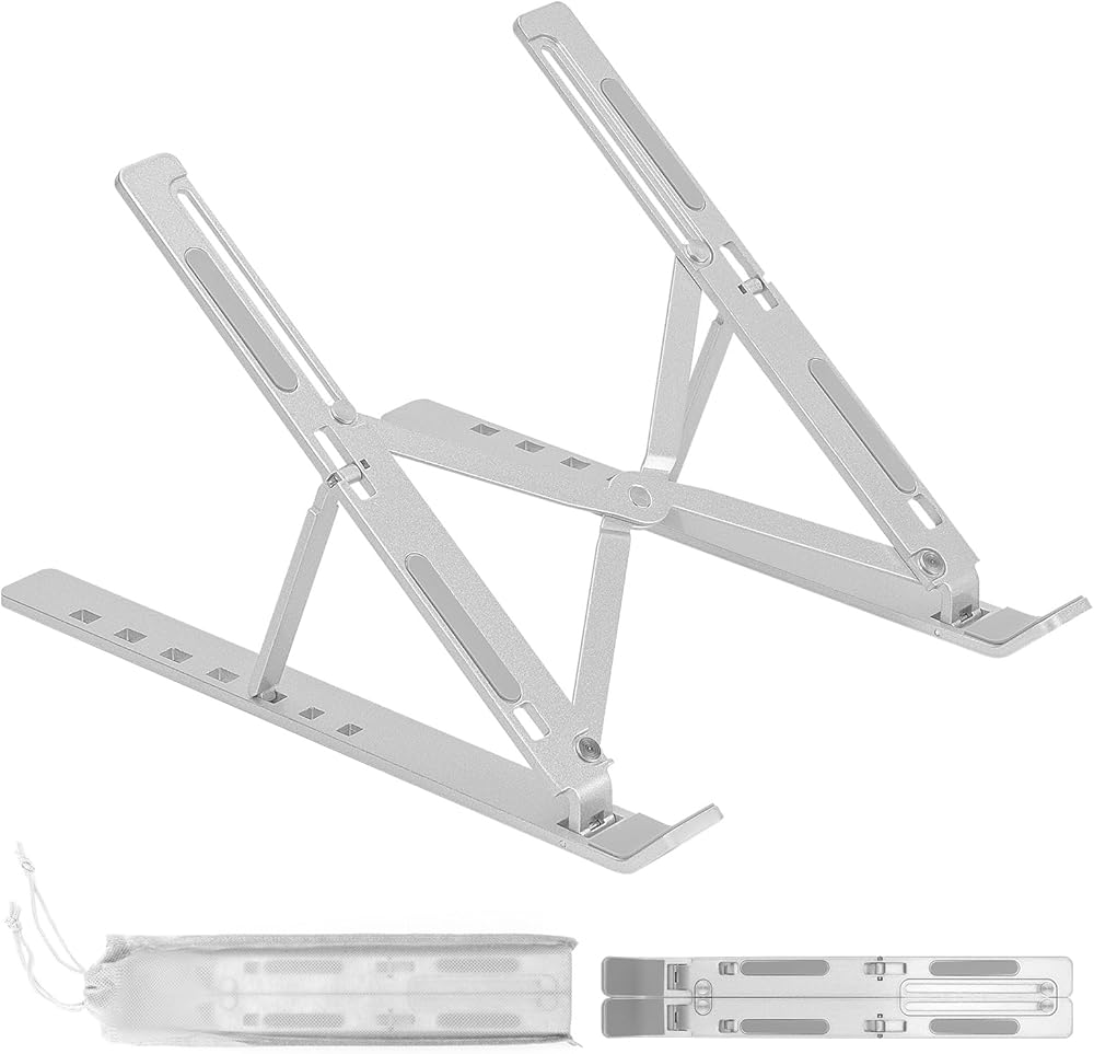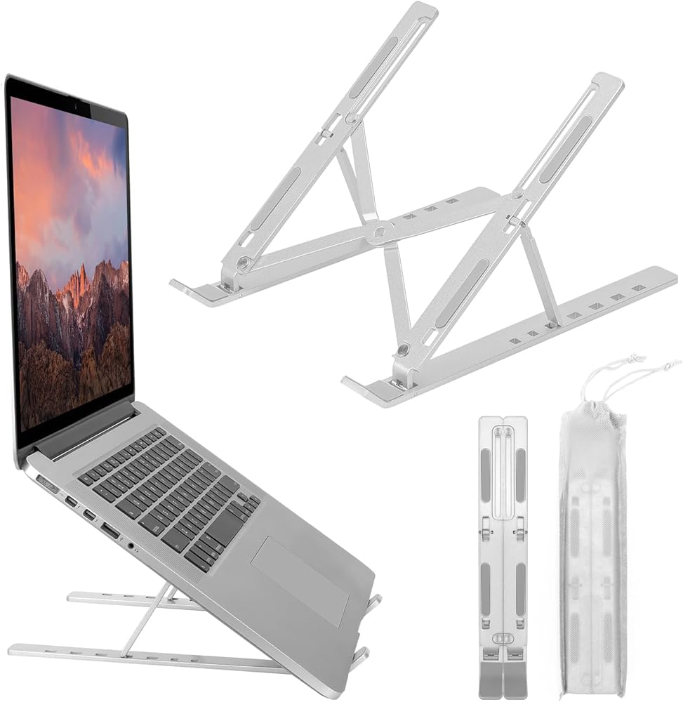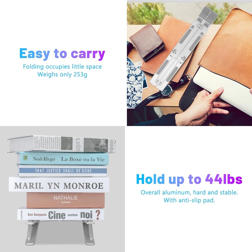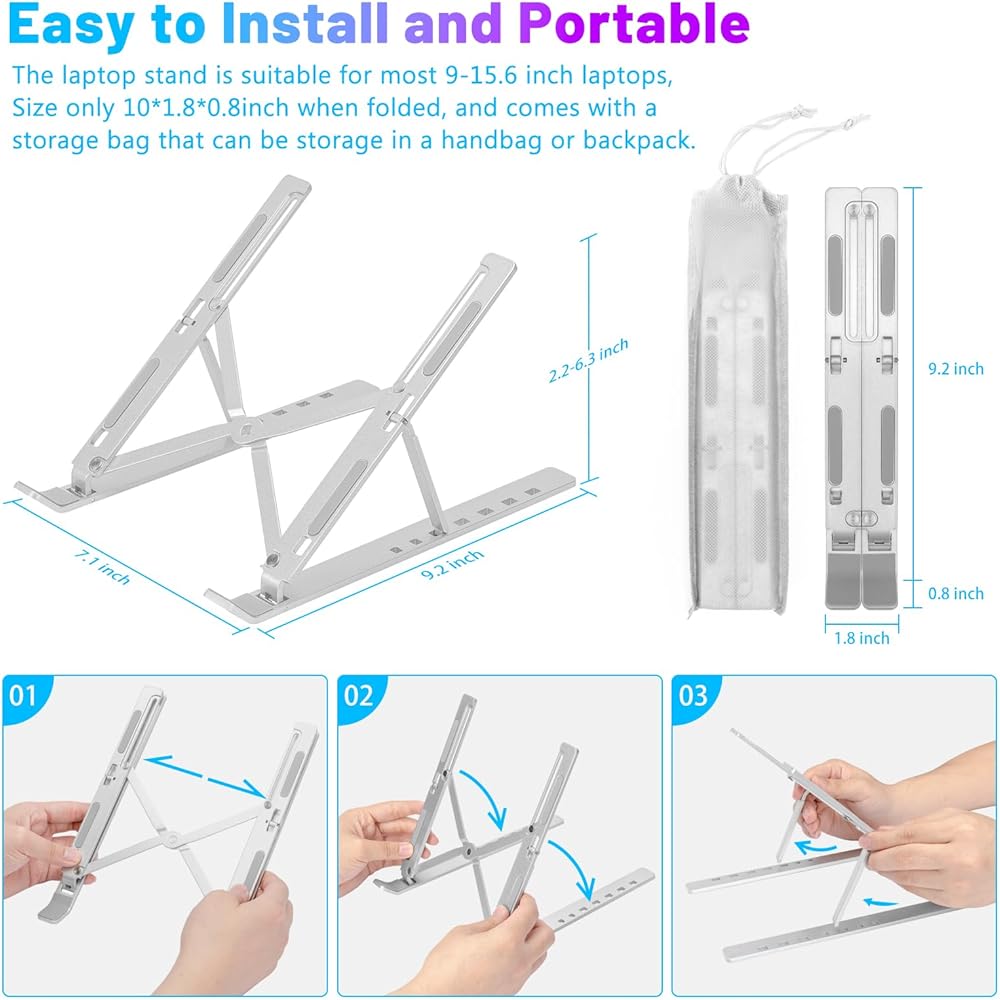 The laptop stand has adjustable angles, with 7 pivot points that can be adjusted to personal preference, allowing for a comfortable position while using a notebook or tablet. The notebook stand is suitable for most 9-15.6 inch laptops, as well as phones, tablets, kindle, and books from 6 inches to 12.9 inches. The laptop holder is made of aluminum and has excellent craftsmanship, with a strong and stable performance and the ability to conduct and dissipate heat. The laptop riser holder has 10 anti-slip rubbers for stability and efficient heat dissipation. The laptop support stand is also foldable and portable, with a size of only 9.8*1.8*0.78inch when folded and a storage bag included.