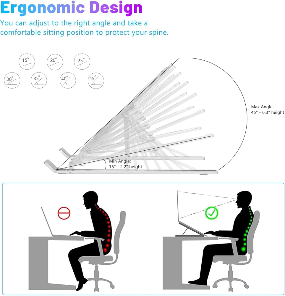 【Adjustable Angle】The laptop stand has 7 pivot points, corresponding to 7 angles, which can be adjusted to a comfortable angle according to personal preference. The larger the angle the higher the screen of laptop. Let you operate your notebook or tablet in a more comfortable position.