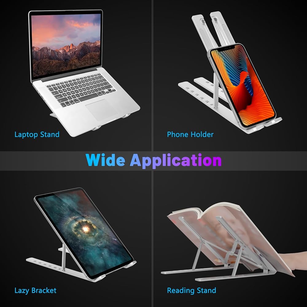 【Wide Application】The laptop stand is suitable for most 9-15.6 inch laptops, such as MacBook (Air,Pro), ThinkPad, Surface, Chromebook, iPad Pro, etc.. It can also be used for phone, tablets, kindle, books from 6 inches to 12.9 inches