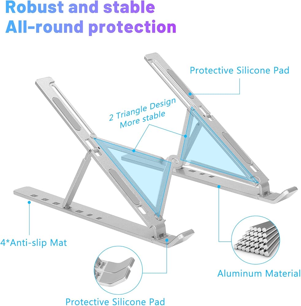 【Multi-slip and Heat Dissipation】The aluminum laptop stand has up to 10 anti-slip rubbers to protect your laptop while keeping your laptop stable on the desktop and not sliding around. Using the stand to hold up your laptop gives it more space for heat dissipation and more efficient heat dissipation compared to laying it flat on the desktop.