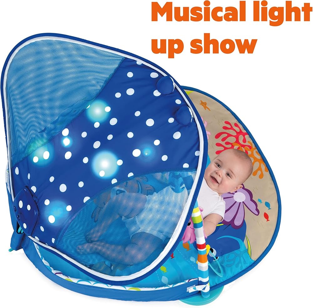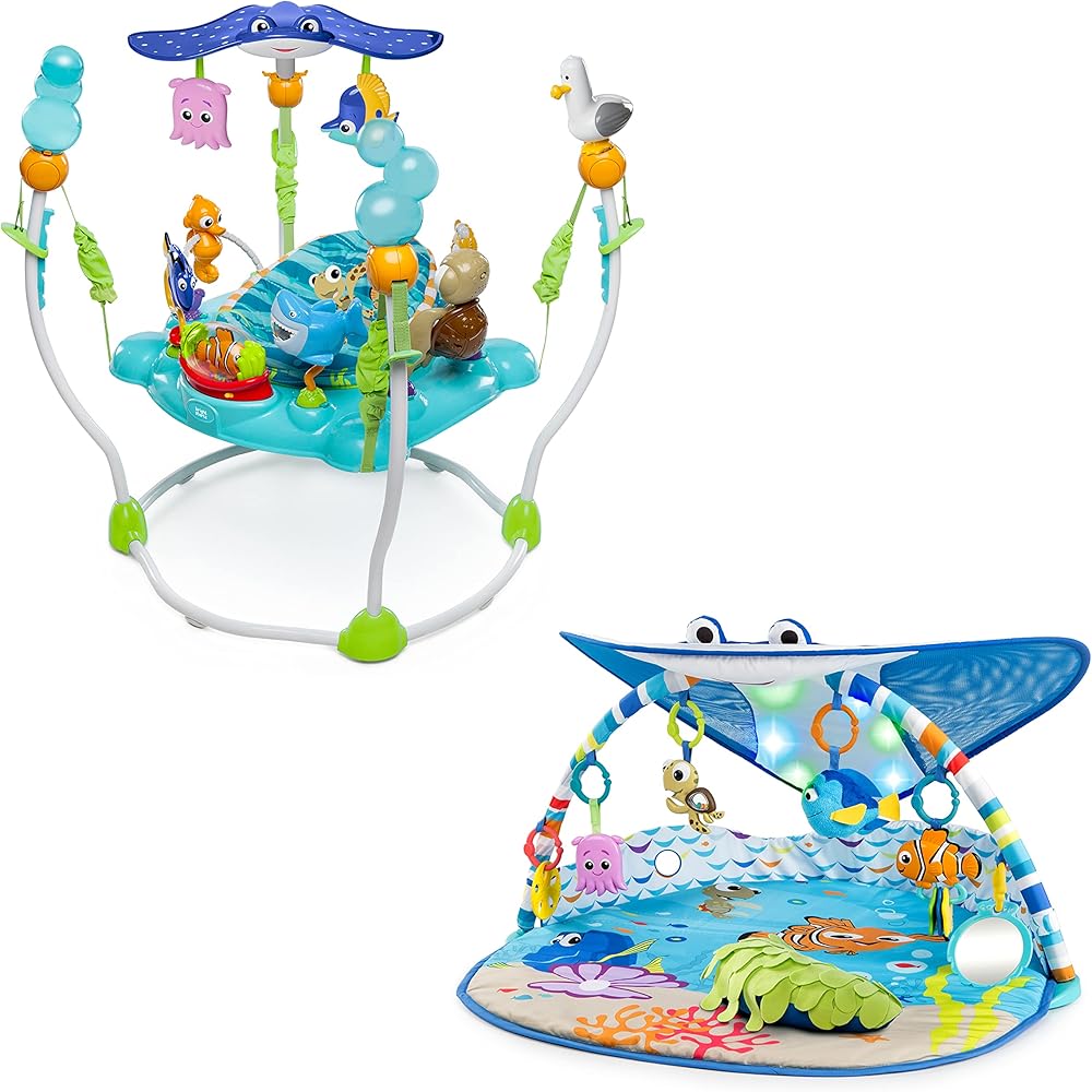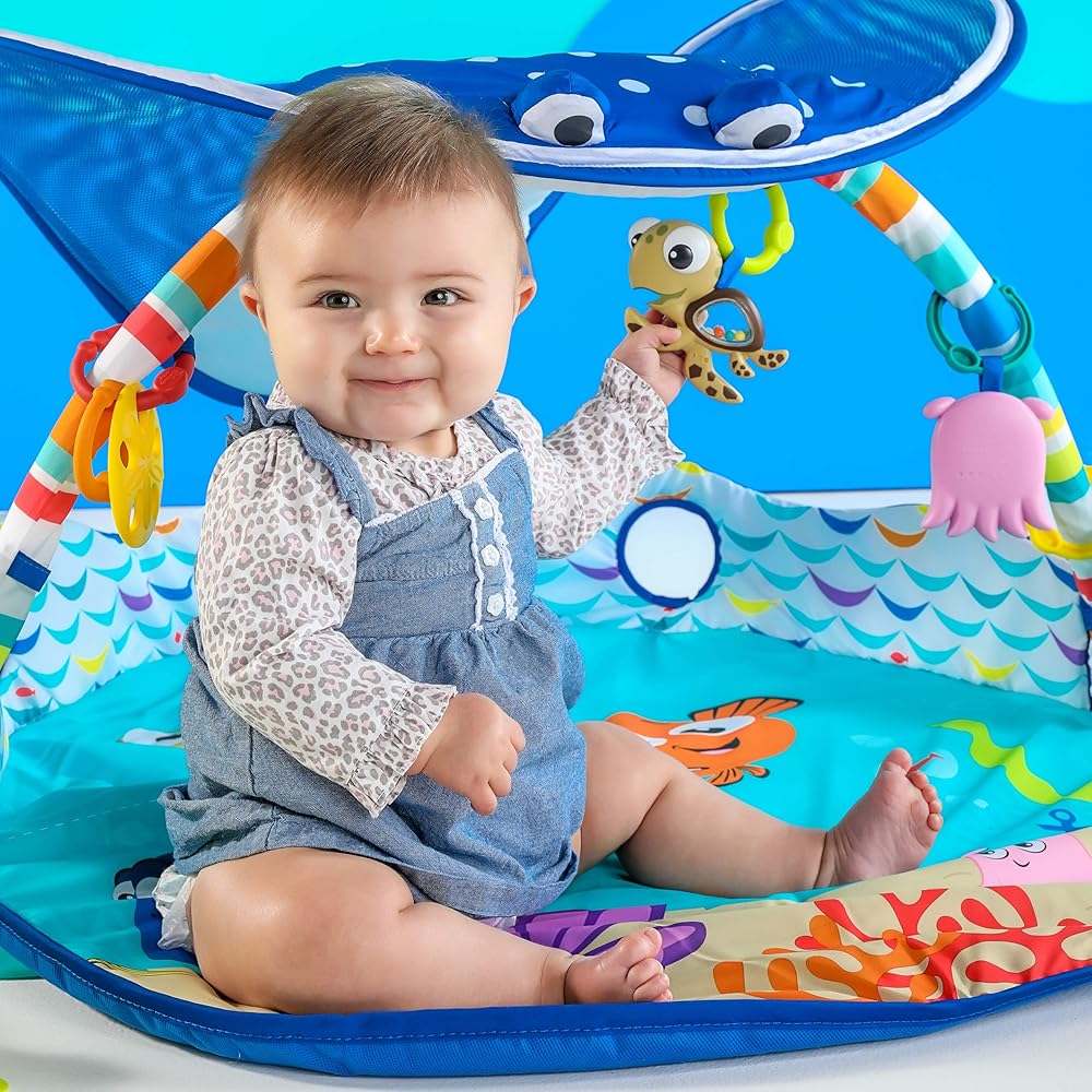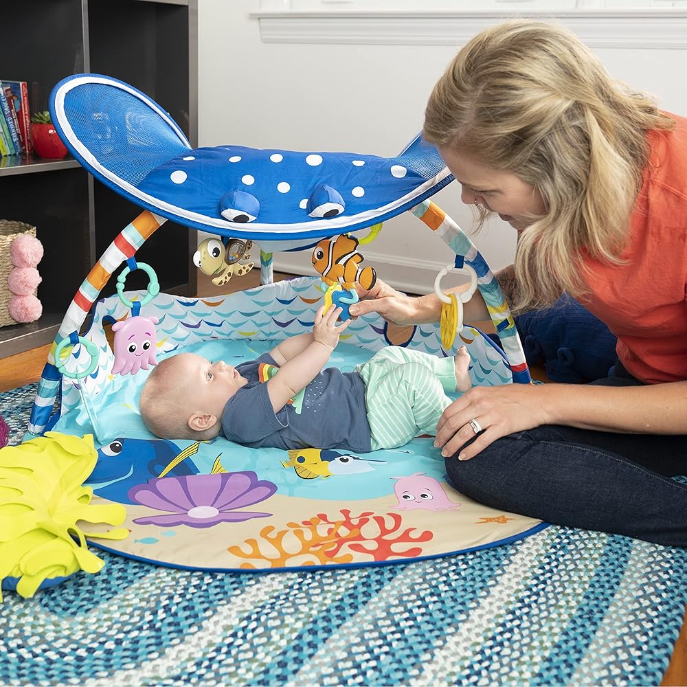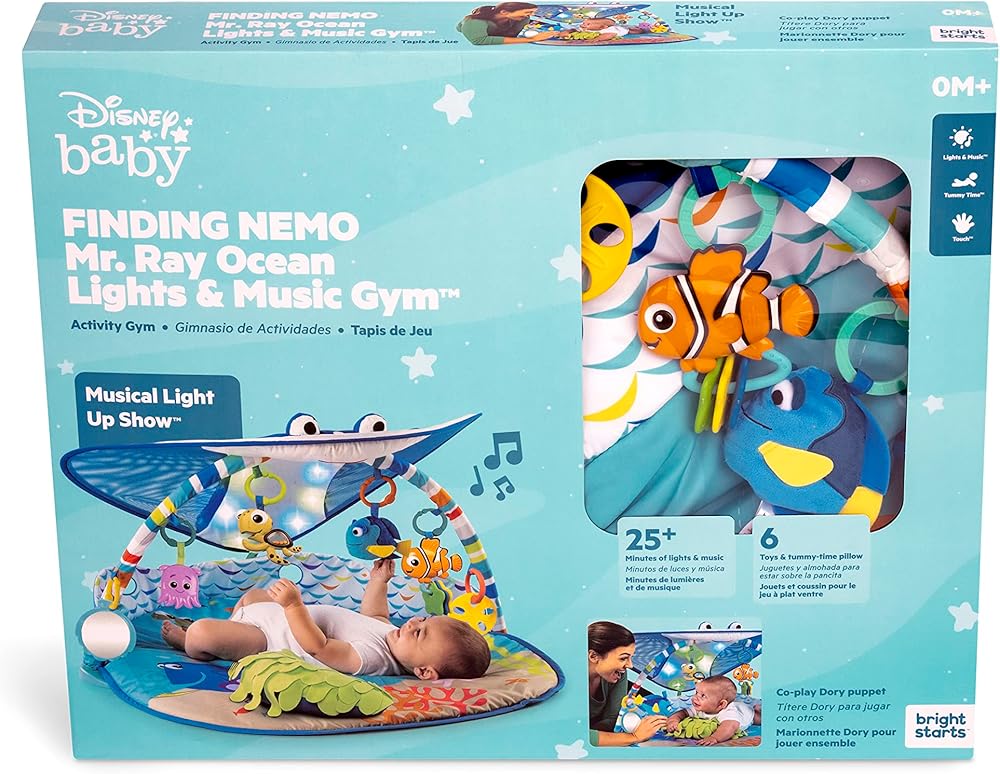 Climb aboard, friends. The world is your underwater oyster with this baby gym. Mr. Ray's cheerful stingray canopy invites all the little fish in the sea to play and explore. Hang out with your favorite Finding Nemo characters, like Crush, Dory (just keep swimming) and Pearl (you guys made me ink). Plus, of course, everyone's favorite clown fish. Nemo! All the fishy friends are detachable on-the-go toys. You can bring the magic of Nemo anywhere! The seaweed-inspired prop pillow is like your baby's own Anemone home during tummy time. When laying on their back, babies can gaze up at Mr. Ray's captivating lights. Get in on the playtime with your baby using the Dory finger puppet. This play gym will make memories that even Dory couldn't forget. Battery, Type AA (Not Included). Wipe clean with damp cloth and mild soap. Do not immerse in water.