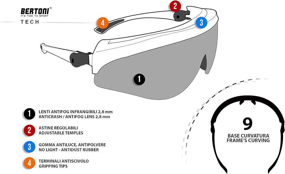 بطانة مطاطية ناعمة داخل الإطار الأمامي لتوفير حماية وملاءمة مثالية، مع أجهزة تهوية مضادة للضباب - قبضة عند طرف الذراع وجسر الأنف: تمنع النظارات الشمسية من الانزلاق