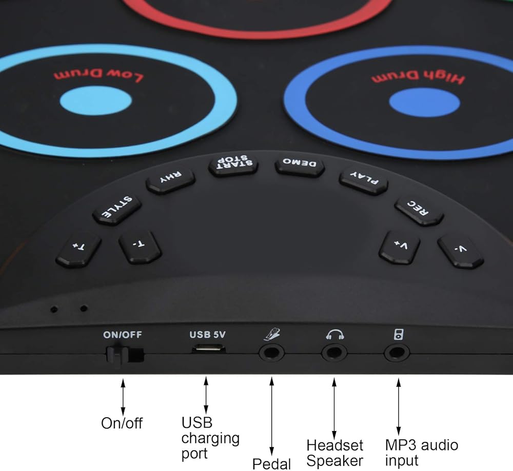 • ꕥღꕥ【PORTABLE】ꕥღꕥSilicone material,foldable and easy to store, convenient for students or video gamers to play.With the portable handle,you can take it as you go,suitable for apartments.With 3.5mm audio input, used to connect MP3/smartphone/tablet to play accompanying music.Built-in 3 drum styles, 8 demo songs and 10 rhythms, support recording and playback functions, volume and speed control.