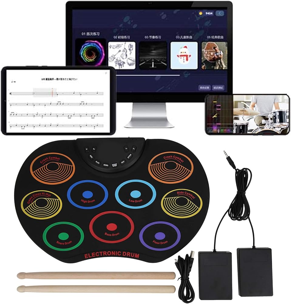 مجموعة الطبول الإلكترونية، مجموعة طبول رقمية محمولة مكونة من 9 منصات قابلة للطي وحساسة للطبل ومكبر صوت مدمج مع مقبس سماعة الرأس/عصي الطبل للأطفال والمراهقين والبالغين المبتدئين، أفضل هدية عيد ميلاد (1#)