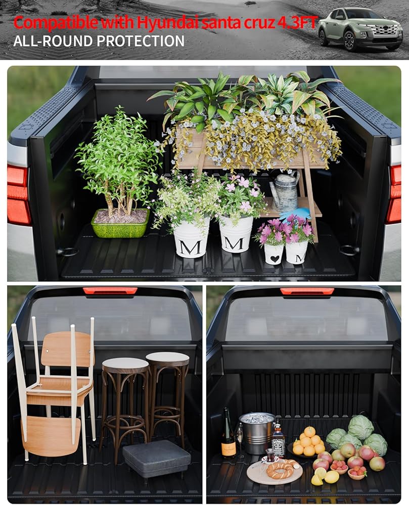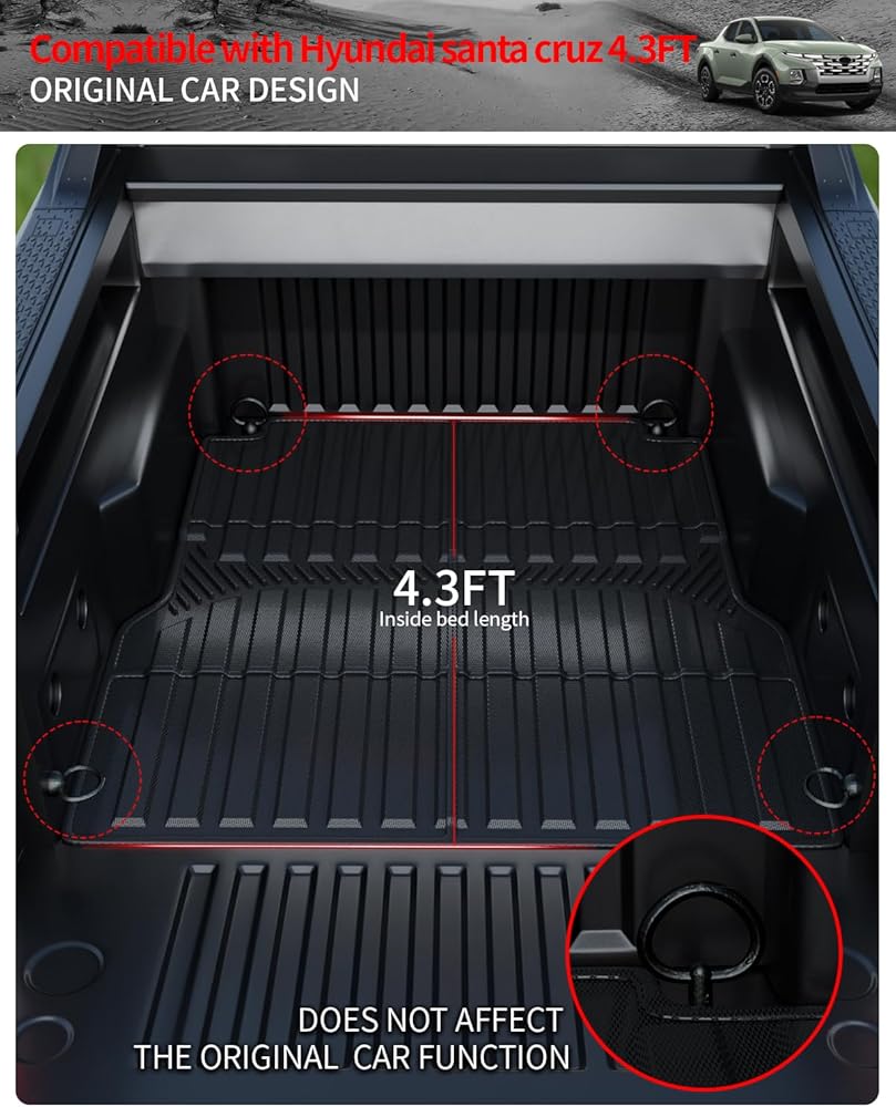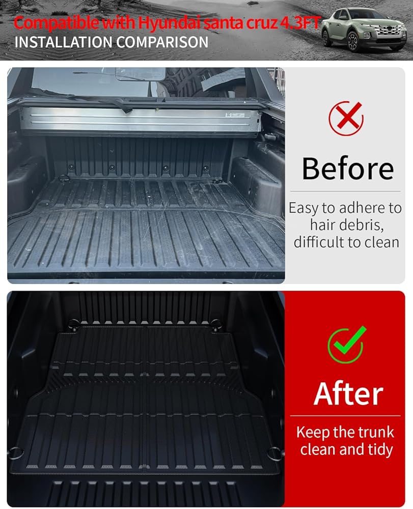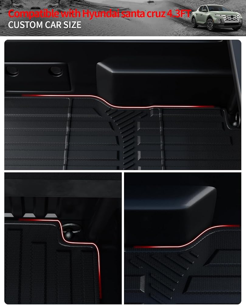 الإعداد: نحن ملتزمون بإنشاء سجادة سرير الشاحنة التي تتوافق مع السرير القصير 2022 2023 2024 Hyundai Santa Cruz بطول 4.3 قدم فقط. يرجى التحقق من طراز سيارتك وعامها قبل طلبها.