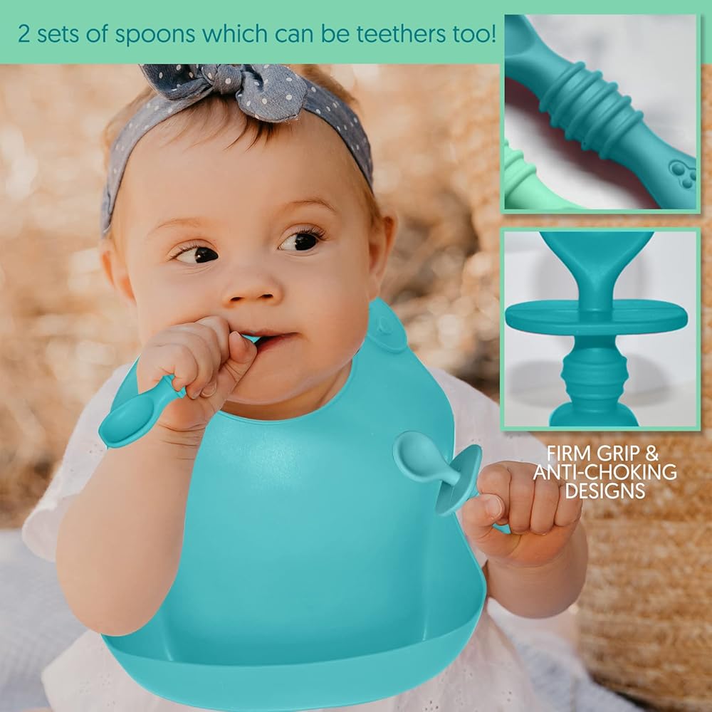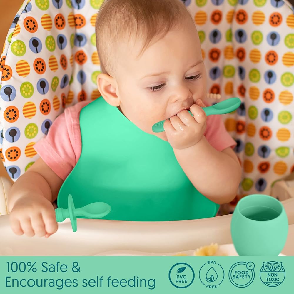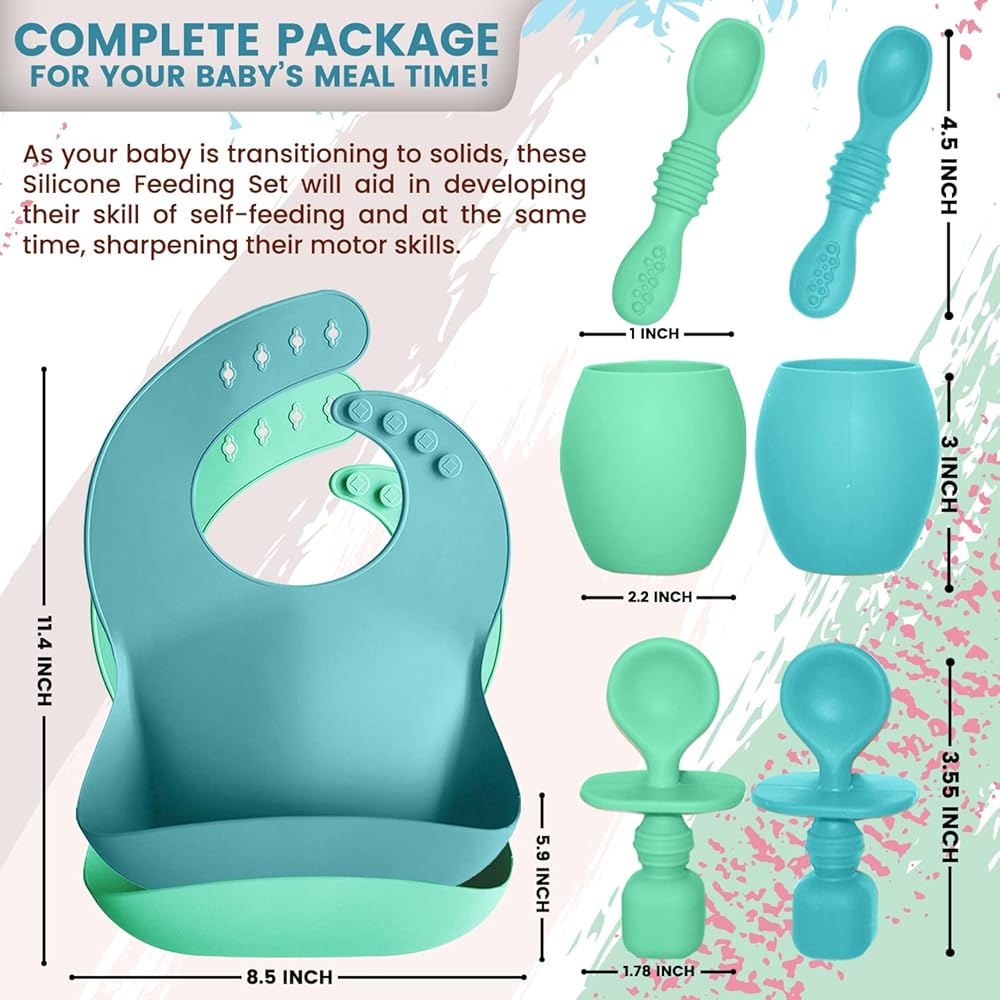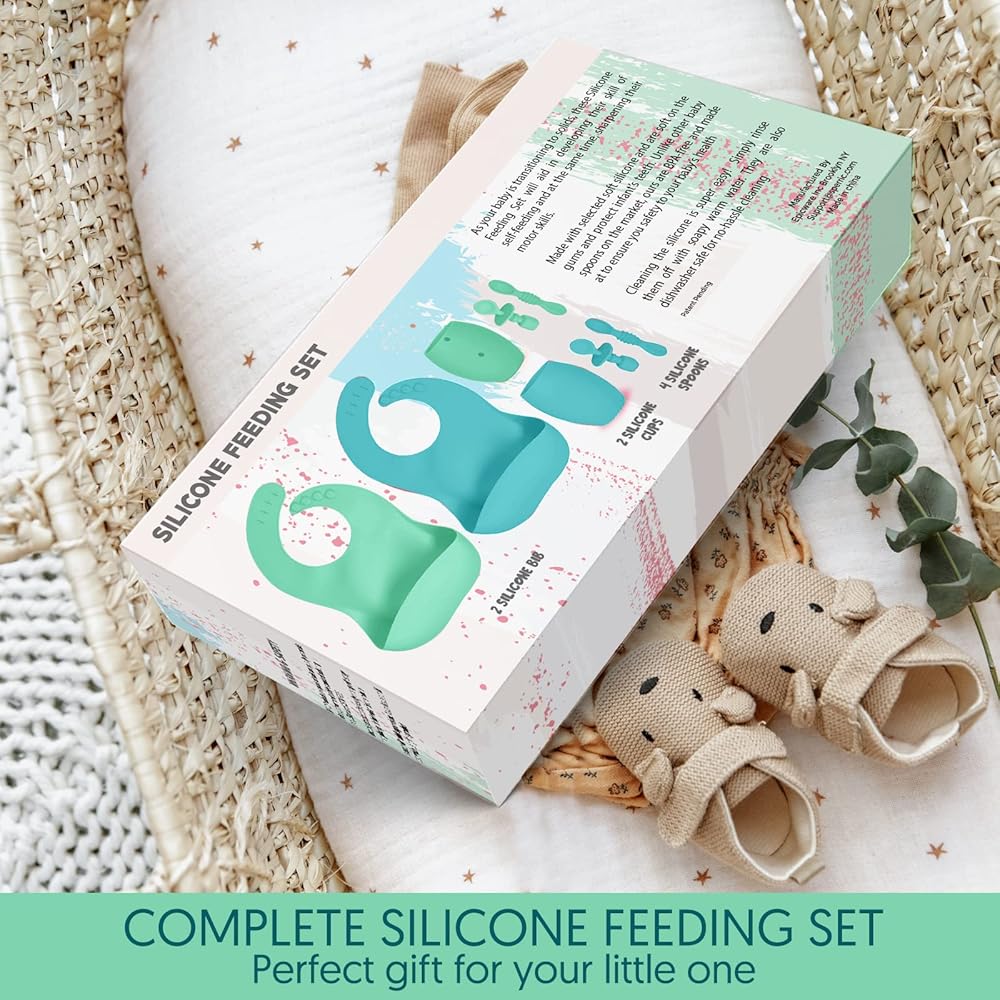 مجموعة تغذية الأطفال المصنوعة من السيليكون - أواني فطام الأطفال، مرايل سيليكون، أكواب تغذية الرضع للأولاد والبنات والأطفال الصغار، مادة ناعمة مقاومة للماء لتناول الطعام العملي، مجموعة من 8 قطع