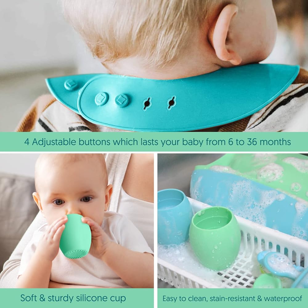 • تنمو مع طفلك الصغير - مع الأزرار الأربعة الموجودة على المريلة، يمكن تعديلها لتناسب جسم طفلك الذي ينمو. ستأخذك الملاعق ذات الأنماط المختلفة أيضًا إلى كل الأعمار والمراحل. والأهم من ذلك، أنه من خلال العلامات الموجودة داخل الكوب، يمكنك بسهولة تتبع كمية السوائل التي يشربها طفلك، وهو أمر بالغ الأهمية لطفلك الصغير الذي ينمو!