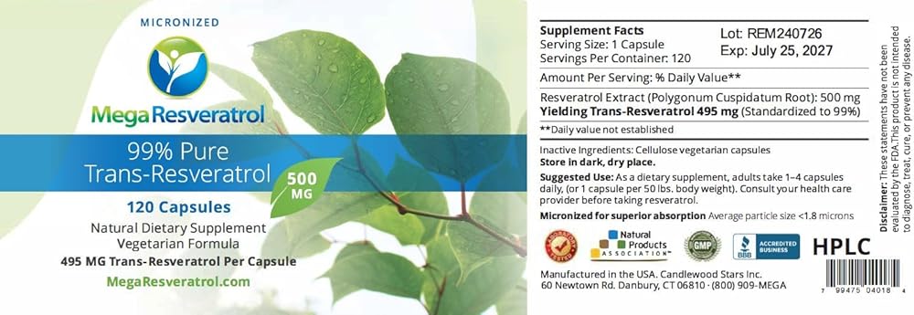 - ✅ كل كبسولة 500 مجم توفر 495 مجم ترانس ريسفيراترول نقي