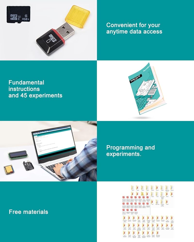 • 【برامج تعليمية مجانية وحزمة بطاقة SD】تتضمن المجموعة برامج تعليمية شاملة وأدلة وبطاقة SD وقارئ بطاقات. البرامج التعليمية مفصلة ولكنها سهلة الاستخدام، مما يساعدك على إتقان برمجة Arduino خطوة بخطوة. توفر بطاقة SD والقارئ مساحة تخزين ملائمة وسهولة الوصول إلى المواد التعليمية.