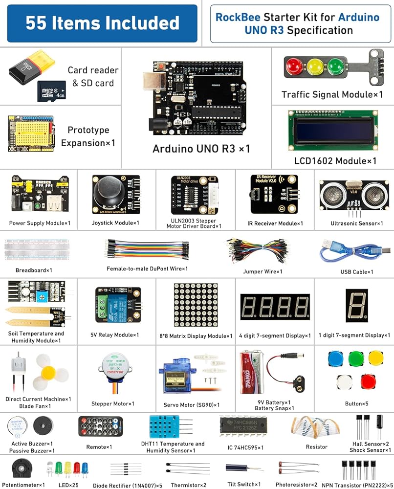 مجموعة أدوات UNO R3 للمبتدئين والبرنامج التعليمي (55 عنصرًا)، مع بطاقة الذاكرة، تستخدم الرقائق الأصلية المتوافقة مع Arduino IDE