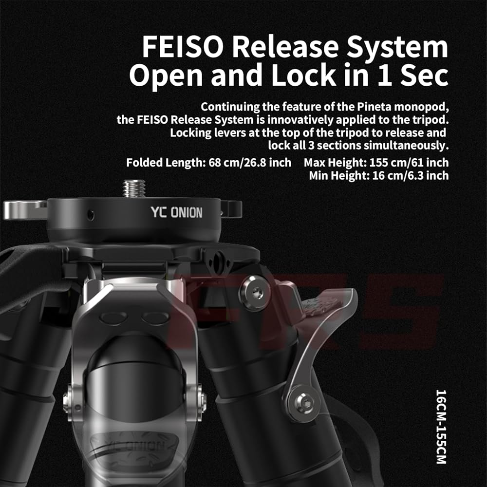 【FEISO Release System - Open and Lock in 1 Second】Continuing the feature of the Pineta monopod,the FEISO Release System is innovatively applied to the tripod.Locking levers at the top of the tripod to release and lock all 3 sections simultaneously.