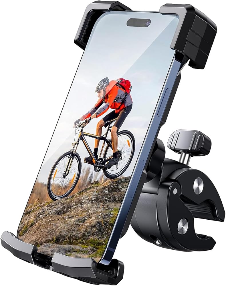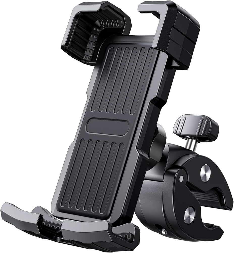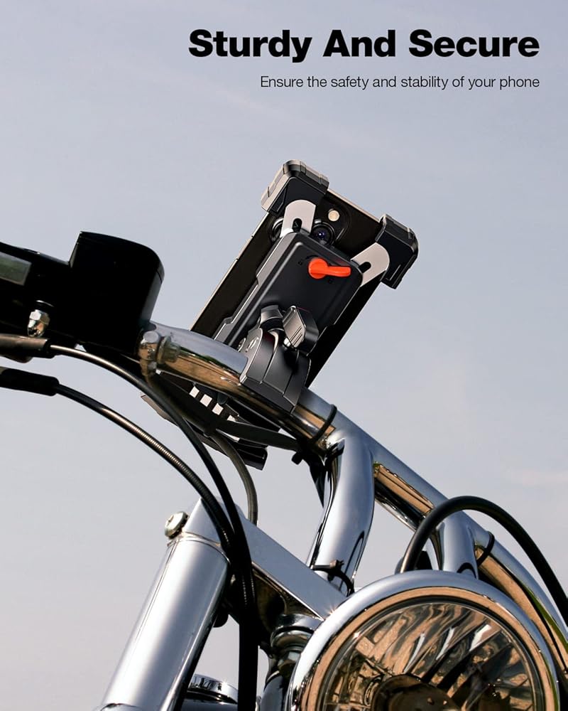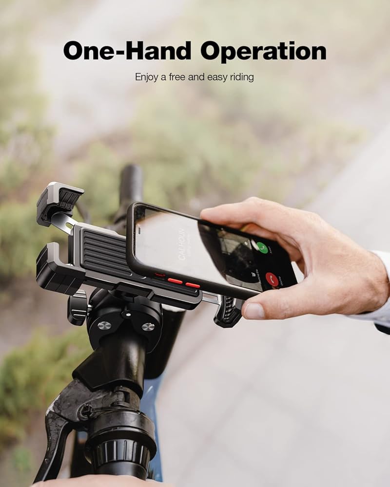 حامل هاتف للدراجة، حامل هاتف للدراجة النارية، قوي وآمن، تشغيل بيد واحدة، دوران 360 درجة، تقليل الاهتزاز، متوافق مع جميع سلاسل iPhone والهواتف المحمولة الأخرى مقاس 4.7 بوصة - 6.8 بوصة.