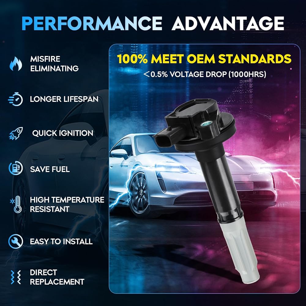 🚗 OE STANDARD: The ignition coil is designed and improved according to the original OE to solve the problems of car shaking, stalling, increased fuel consumption, engine fault light, etc. It effectively improves engine performance and gives you a comfortable driving experience.
