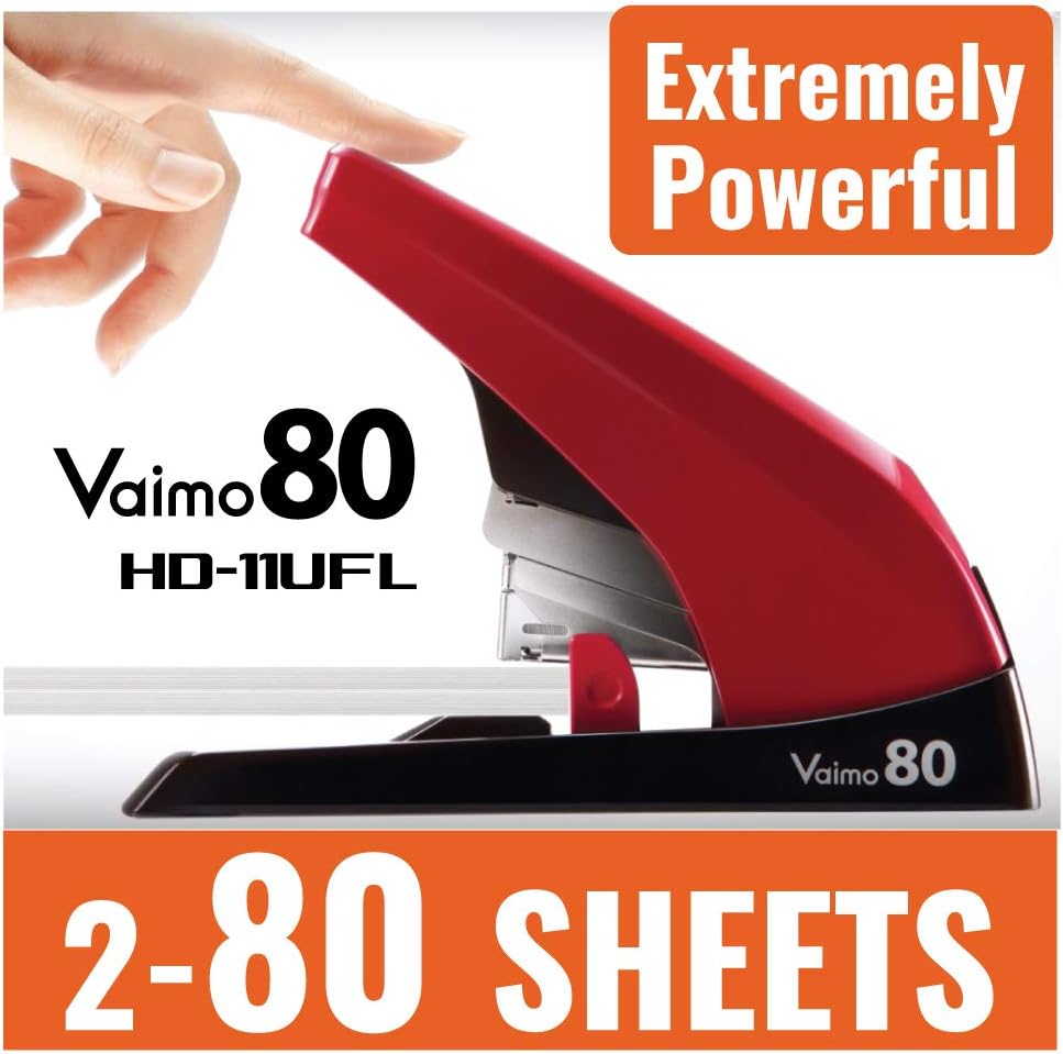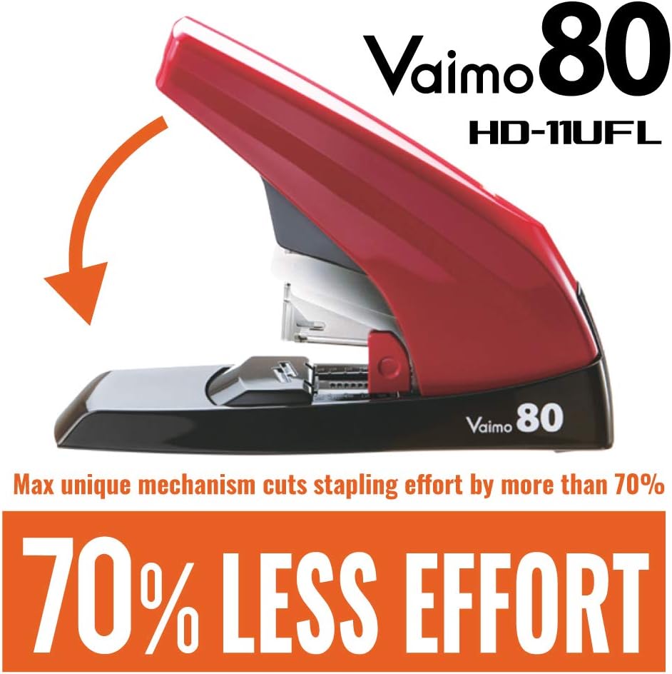 MAX Vaimo 80 Compact Heavy Duty Flat Clinch Stapler easily staples up to 80 sheets! MAX unique mechanism cuts stapling effort by more than 70%. Light weight & Compact. One staple size for 2 to 80 sheets. Uses MAX NO.11-80 (MXB-NO1180) staples. Clean Flat Clinch Finish allows papers to stack evenly and neatly. One touch open to load staples, front loading mechanism. Adjustable throat depth (1 ¼”).