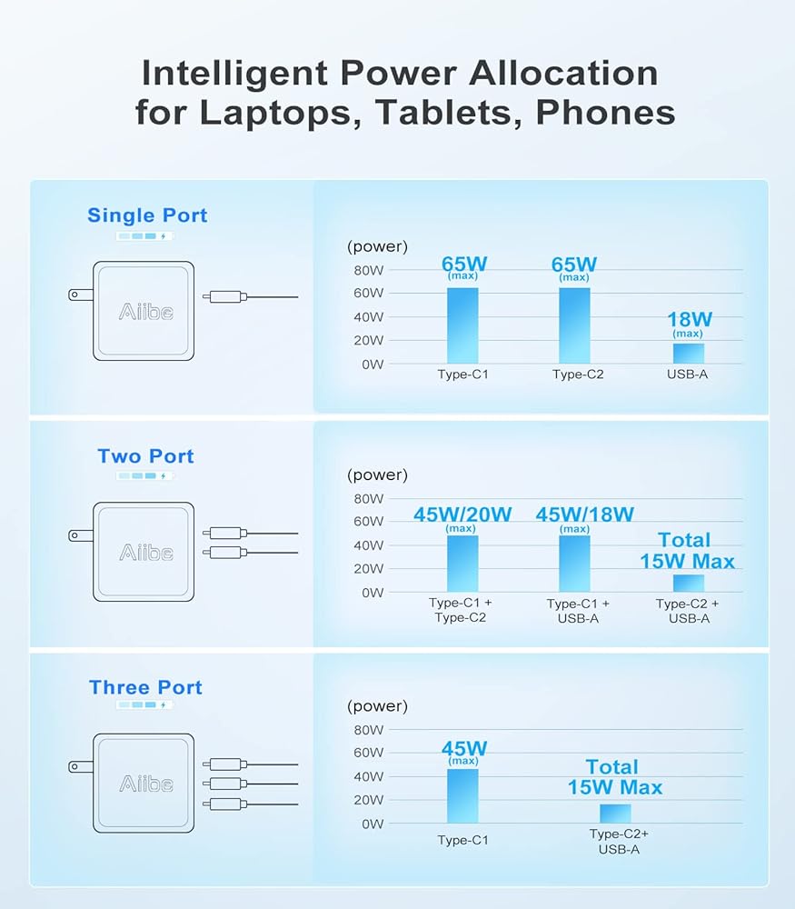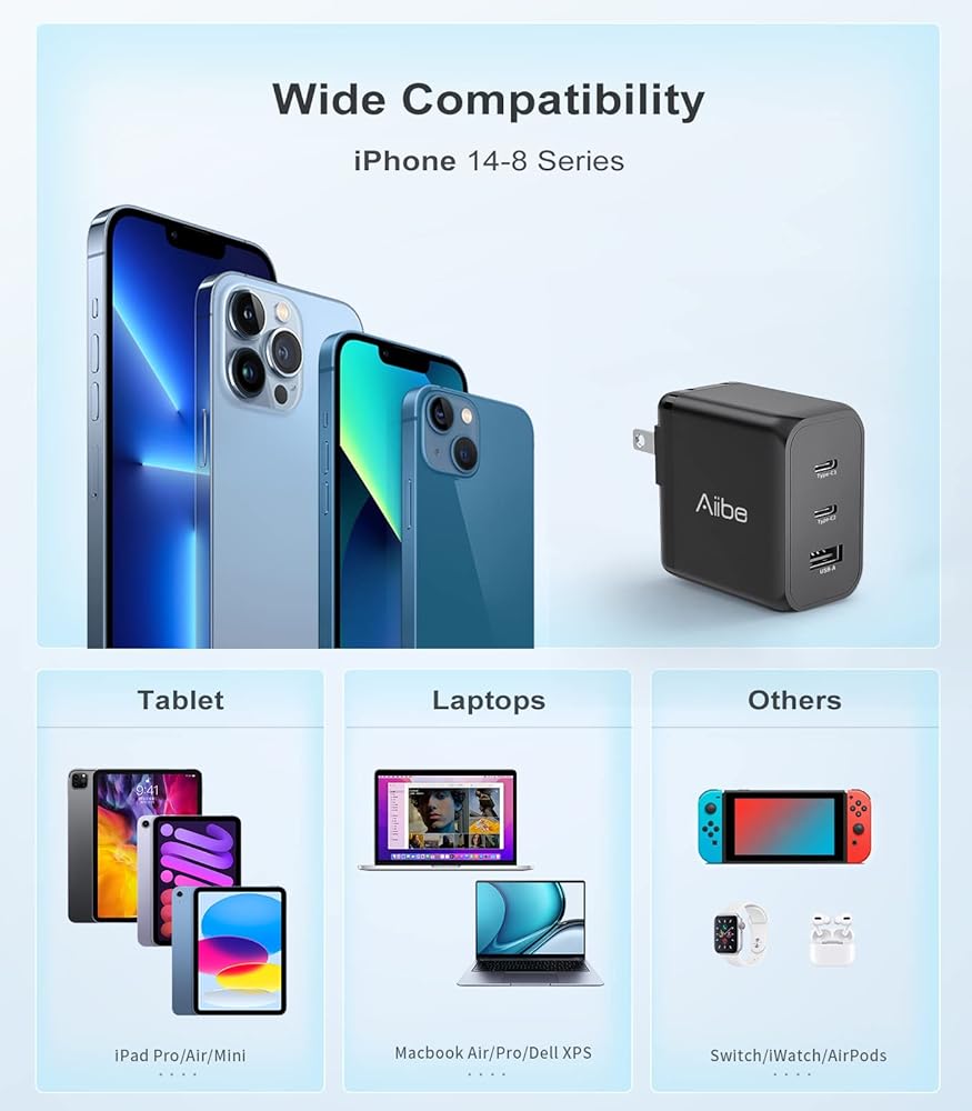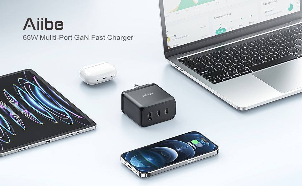 Aiibe USB C شاحن 65W 3-Port PD 3.0 شاحن سريع 65W GaN Wall Charger USB C Charger Block Type-C محول قابل للطي لـ MacBook Pro/Air، iPad Pro، iPhone 15/14/Pro، Galaxy S23 S22، Dell XPS13، أجهزة الكمبيوتر المحمولة