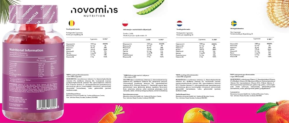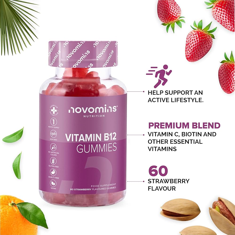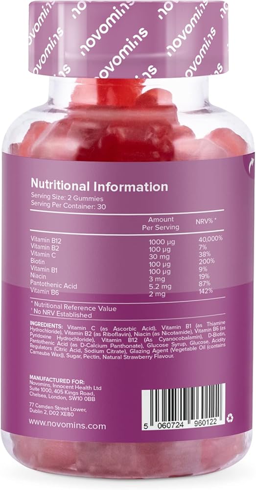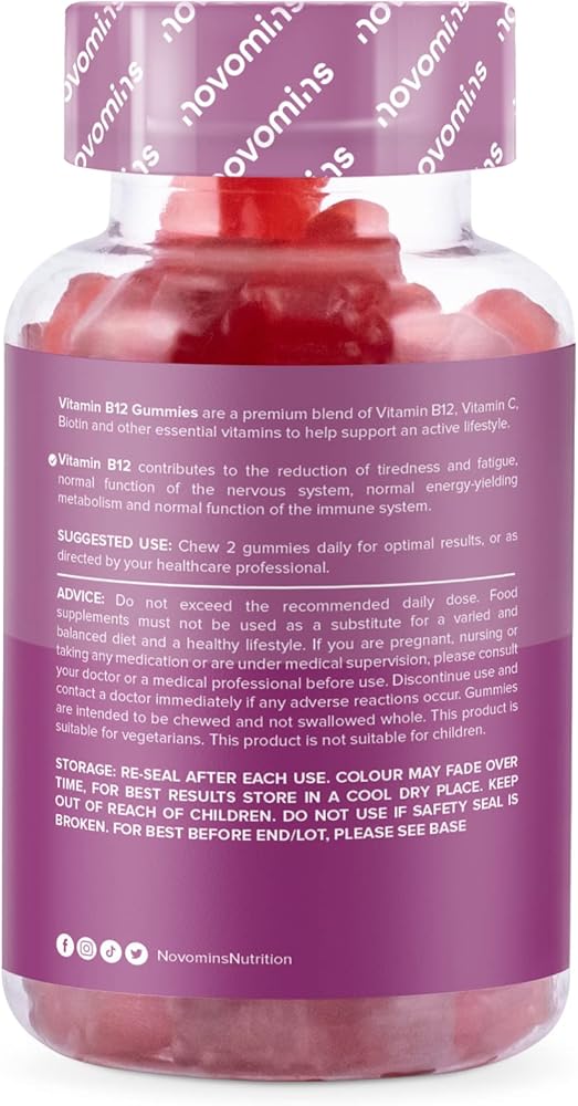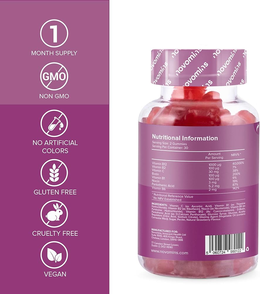 WHY NOVOMINS VITAMIN B12 GUMMIES: Novomins prides itself in bringing you the highest quality supplements whilst being safe and ethically sourced. Our Vitamin B12 Gummies are produced under the strictest manufacturing standards (GMP) with the purest quality ingredient, ethically sourced and easily digestible. We also offer a full money back guarantee if you're at all dissatisfied, please contact us through amazon.