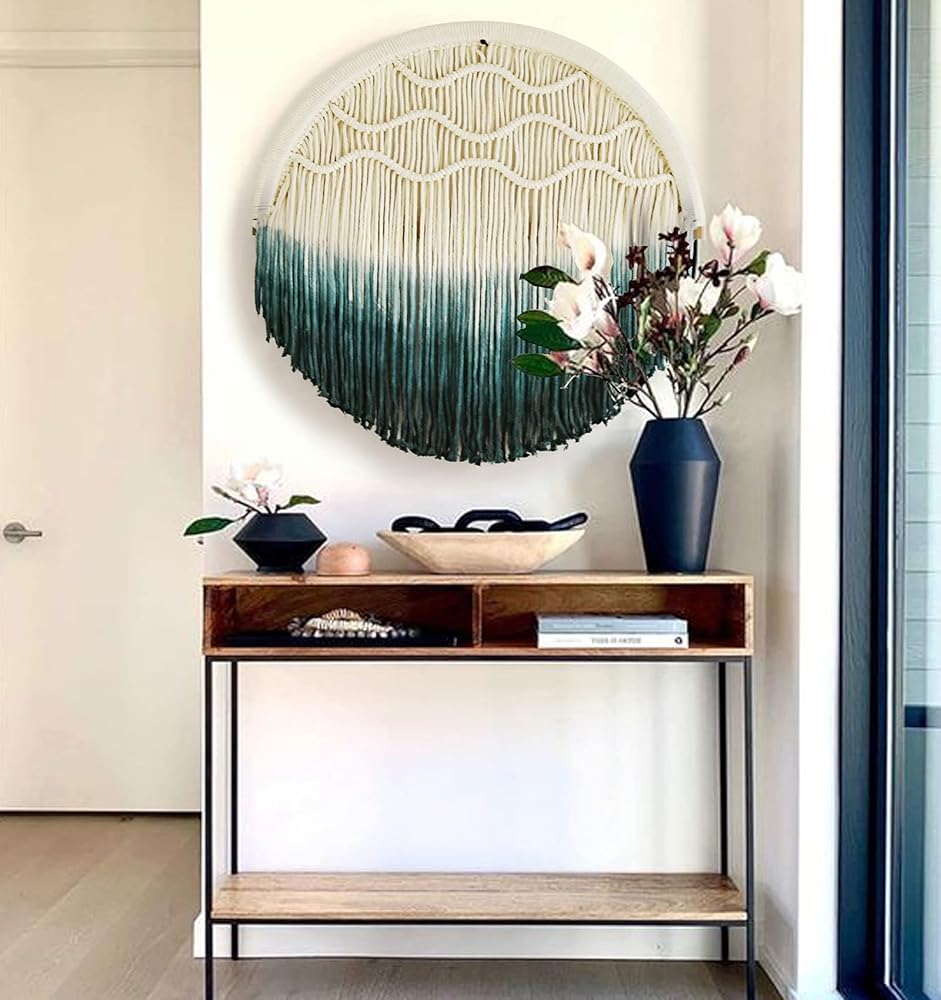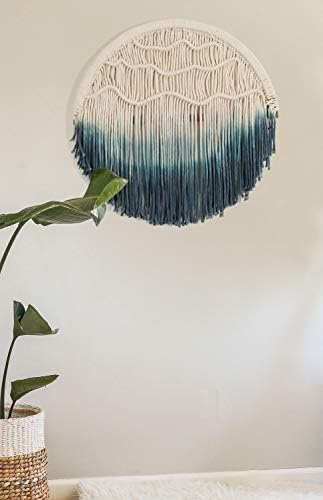 التفاصيل: لوحة ألوان دائرية فريدة من نوعها مصبوغة على الحائط من هذه القطعة هي كما يلي - تبدأ باللون الأزرق المصبوغ بتدرج بسيط، وينتهي الجزء السفلي باللون الأزرق الداكن العميق. مع زخرفة دقيقة من الألياف في الأسفل لإكمال الشكل الدائري، يعد هذا النسيج قطعة مذهلة وملهمة لأي جدار.