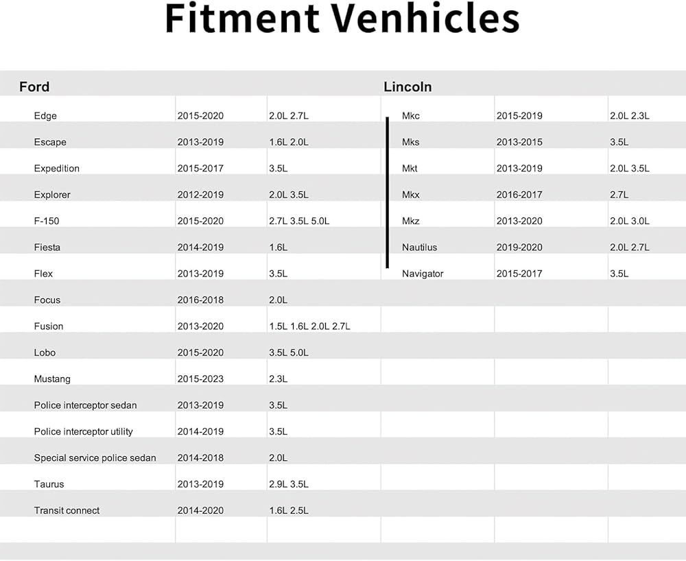 💙مناسب لـ: Ford2015-2020 Edge 2.0L,2.7L.2013-2019 Escape 1.6L,2.0L.2015-2017 إكسبيديشن 3.5L.2012-2019 Explorer 2.0L,3.5L.2015-2020 F-150 2.7L, 3.5L,5.0L.2014-2019 فييستا 1.6L.2013-2019 فليكس 3.5L.2016-2018 التركيز 2.0L.2013-2020 فيوجن 1.5L,1.6L,2.0L,2.7L.2015-2020 لوبو 3.5L, 5.0L.2015-2023 موستانج 2.3L.2013-2019 سيارة سيدان اعتراضية للشرطة 3.5L.2014-2019 أداة اعتراضية للشرطة 3.5L.2014-2018 سيارة سيدان للشرطة ذات خدمة خاصة 2.0L.2013-2019 برج الثور 2.9L,3.5L.2014- 2020 ترانزيت كونكت 1.6 لتر، 2014-2020 ترانزي