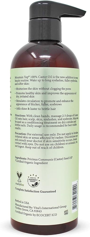 من خلال عملية استخلاص عصر بارد من النباتات الراسينوس، يحافظ زيت الخروع الجبلي توب على الأملاح والإسترات المفيدة للعمل كعوامل تكييف البشرة والشعر. يفقد مصنعون آخرون هذه المركبات باستخدام الحرارة أثناء طريقة الاستخلاص. يُستخدم زيت الخروع حاليًا في أكثر من 600 منتج تجميلي في العالم بسبب قدرته على تعزيز رموش أكثر سمكًا وحواجب أكثر امتلاءً مع الحفاظ على مستويات رطوبة البشرة. فقط كمية صغيرة على البشرة والرموش والحواجب يمكنها تحسين صحة ومظهر بشرتك وشعرك. لا توجد إضافات أو روائح صناعية لزيت الخروع الخاص بنا. خالي من المكونات القاسية مثل البارابين والكبريتات. يتم إنتاج جميع منتجات مونتين توب وتعبئتها في منشأتنا الجنوبية كاليفورنيا الواعية للبيئة.