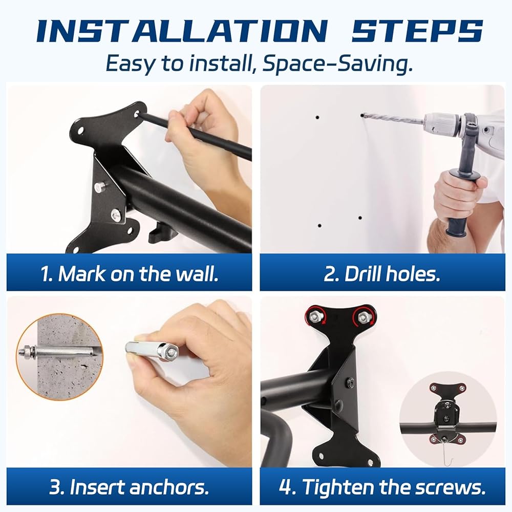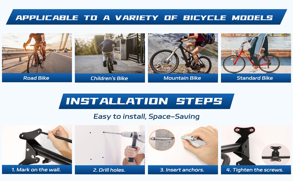 【تركيب بدون متاعب】تركيب شماعة الدراجة الخاصة بنا أمر سهل. نحن نقدم جميع الأجهزة اللازمة وتعليمات واضحة لضمان الإعداد السريع والسهل. اقضي وقتًا أقل في التجميع ووقتًا أطول للاستمتاع بمساحتك المنظمة حديثًا.