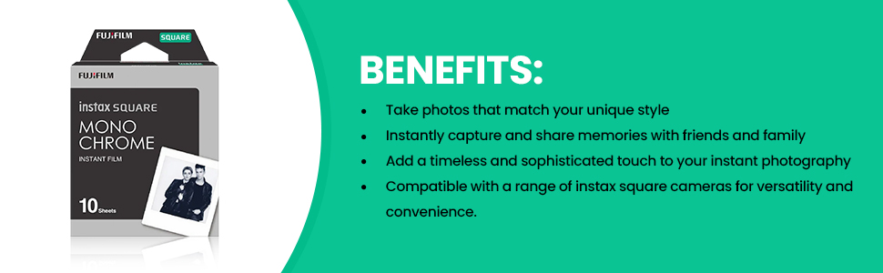 Instant Photography Fun: Fujifilm Instax Square Monochrome instant film is a fun and easy way to capture and share memories with friends and family. The film produces unique, vintage-inspired photos with a distinctive black and white aesthetic.