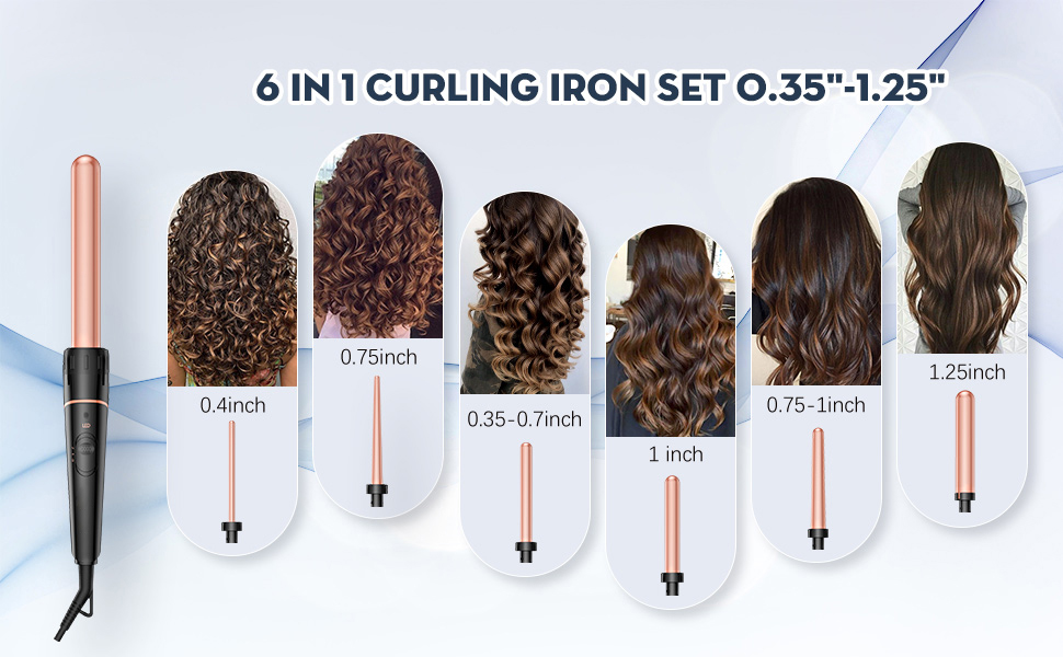 • ابتكر أنماطًا متعددة الاستخدامات مثلك: يجمع التصميم الفريد 6 في 1 بين عصا رفيعة 0.4 انش، وعصا صغيرة 0.75 انش، وعصا مدببة 0.35-0.75 انش، وعصا مدببة 0.75-1 انش، وعصا كبيرة 1 انش، وعصا سميكة 1.25 انش في أداة واحدة. بفضل تصميمها القابل للتبديل، ستسمح لك مجموعة عصا الشعر هذه بابتكار أي تسريحة تريدها في المنزل أو في الصالون أو أثناء التنقل.