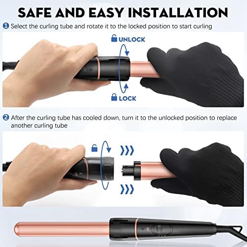 • سهلة الاستخدام: تصميم سريع التركيب يجعل من السهل تغيير مكواة تجعيد الشعر المختلفة. تدعم مجموعة أدوات تجعيد العصا الجهد المزدوج (100-240 فولت)، مما يجعلها ضرورية للسفر أو نمط الحياة أثناء التنقل. نقدم قفاز واحد ومشبكين للشعر مما يضيف قيمة إضافية إلى طلبك.