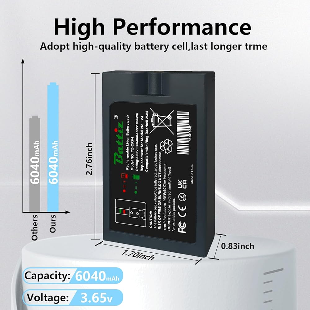 🔔【BATTERY PARAMETERS】:Replacement for Ring Battery 1 Pack;Compatible Part Model No:V4; Battery Type: Li-ion. Voltage: 3.65V,Capacity: 6040mAh/22.046Wh.Premium cells create quality batteries.high battery capacity for continuous surveillance.