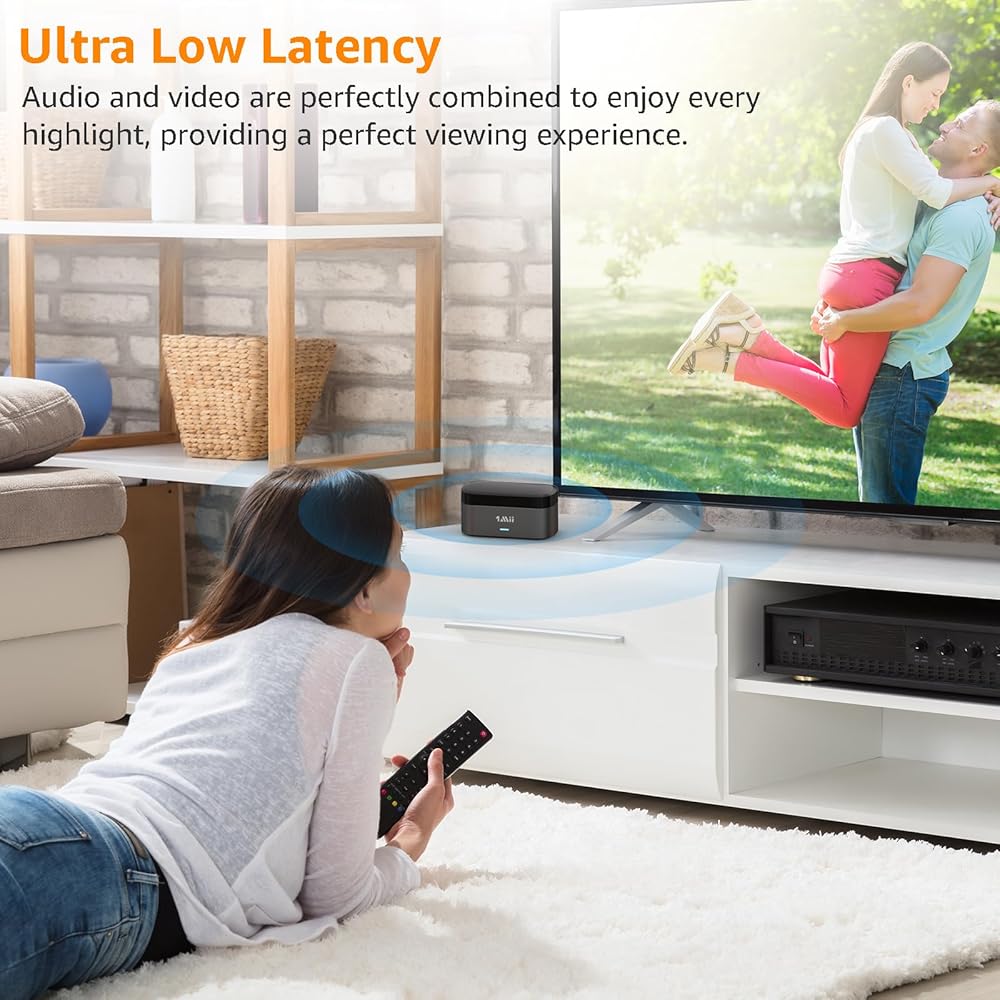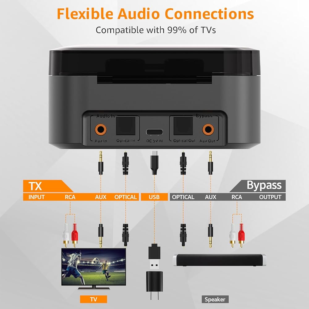 التوصيل والتشغيل: تحتاج فقط إلى توصيل منفذ إدخال الصوت لجهاز الإرسال بمنفذ إخراج الصوت للتلفزيون، ثم توصيل جهاز الإرسال بمصدر الطاقة، وسوف تتصل سماعات الرأس تلقائيًا بجهاز الإرسال، ويمكنك إخراج سماعات للاستخدام. تأتي سماعات الأذن اللاسلكية للتلفزيون مع كابل ألياف بصرية وكابل RCA وكابل 3.5 ملم، وهي متوافقة مع 99% من أجهزة التلفزيون الموجودة في السوق.