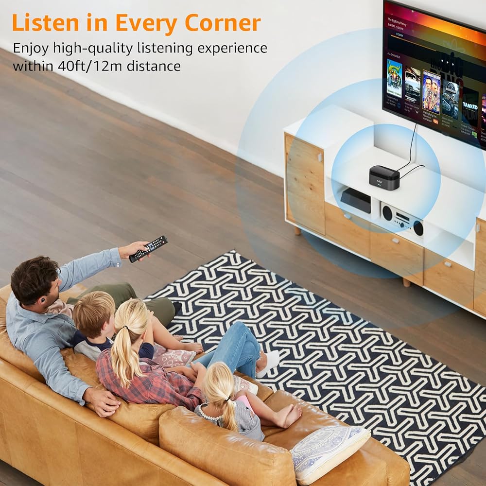 الرفيق المثالي للتلفزيون: هذا هو رفيقك المثالي عند مشاهدة التلفزيون، ويمكن أن يدوم حتى 5 ساعات بشحن واحد، عندما لا تشاهد التلفزيون، ما عليك سوى وضع سماعات الأذن في قاعدة جهاز الإرسال وإخراجها في المرة القادمة. يمكن استخدامها ولا داعي للقلق بشأن البطارية.