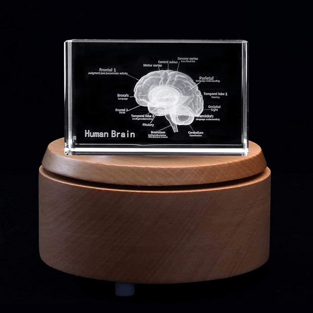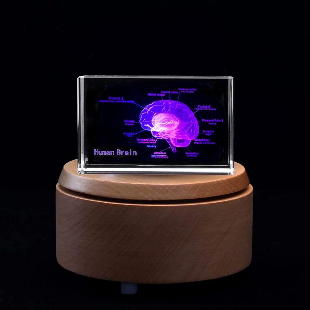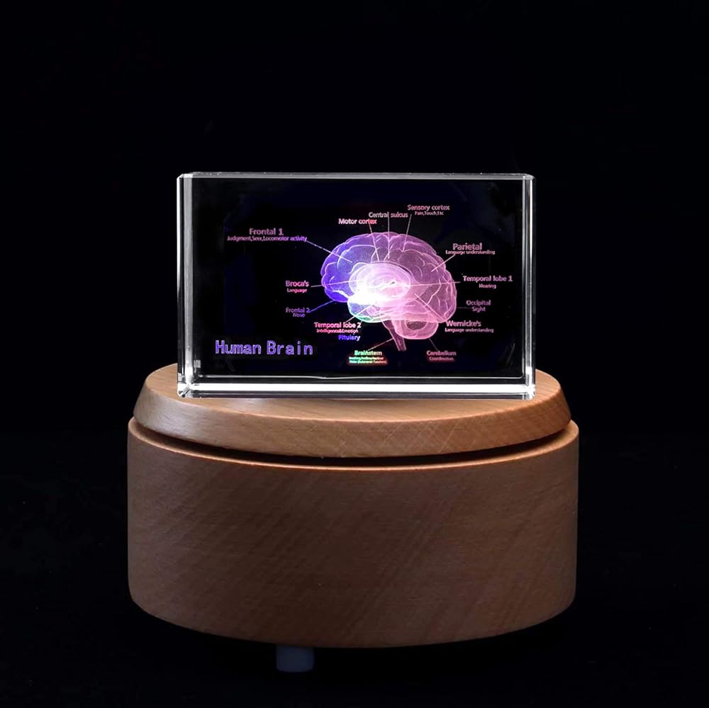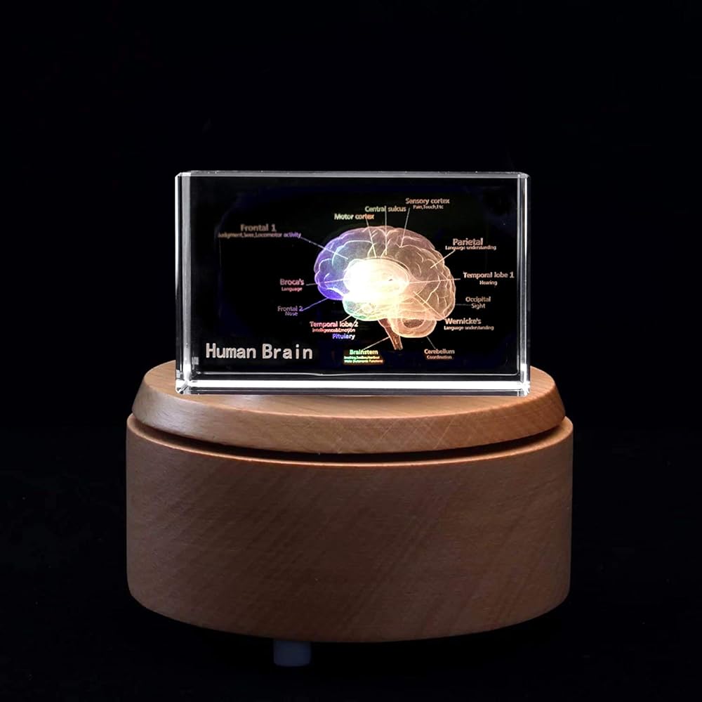 3D Human Brain with Labels Anatomical Model Paperweight(Laser Etched) in Crystal Glass Cube Science Gift.Package includes:a 3.1x2x2 inch crystal glass cube,a colorful LED base,a USB cable.