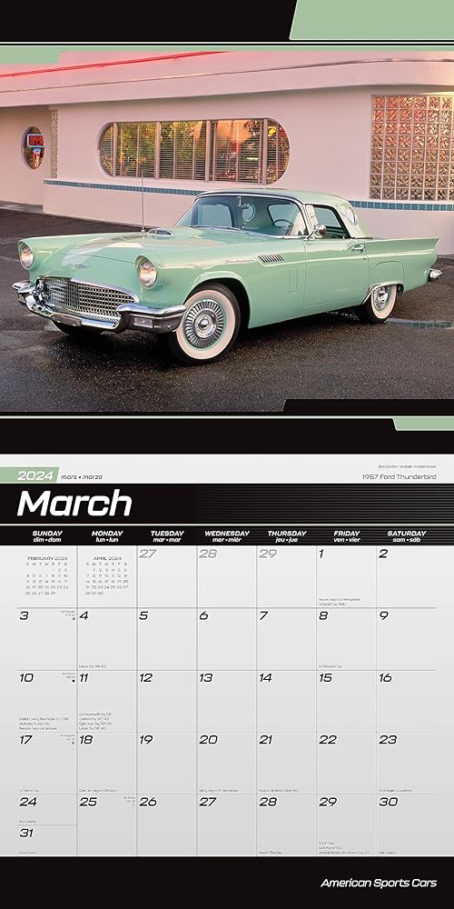 This 2024 American Sports Cars calendar is printed on premium heavyweight deluxe paper. Large grids to mark appointments and events. Observes major holidays and moon phases. This American Sports Cars 2024 wall calendar measures 12 x 12 inches closed and 12 x 24 inches opened.