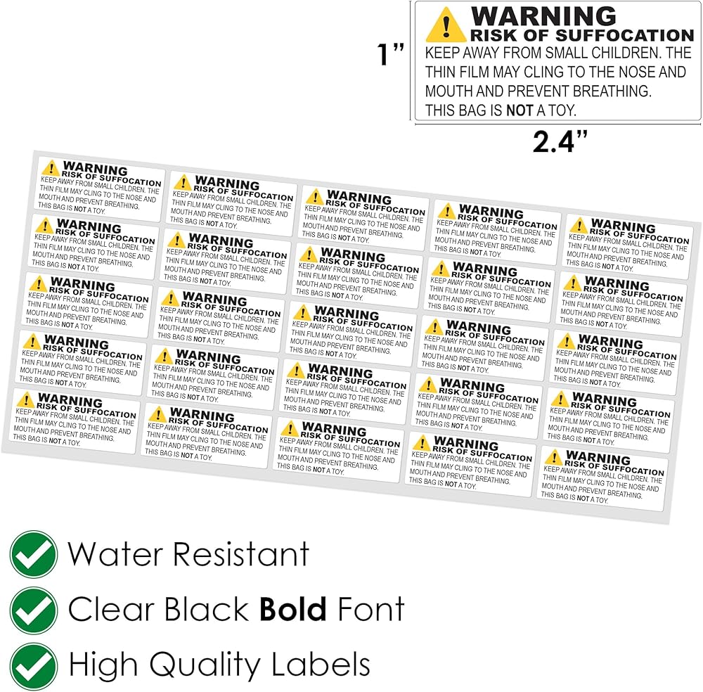 High quality: 2.4 inch by 1 inch choking warning labels will not fade, smear, or bleed and is ready to use. Strong adhesives will bond to various surfaces and labels are water resistant. The large clear font reads easily and is scratch proof. Meets shipment requirements for shipping items in clear bags while keeping children safe from potential suffocation.