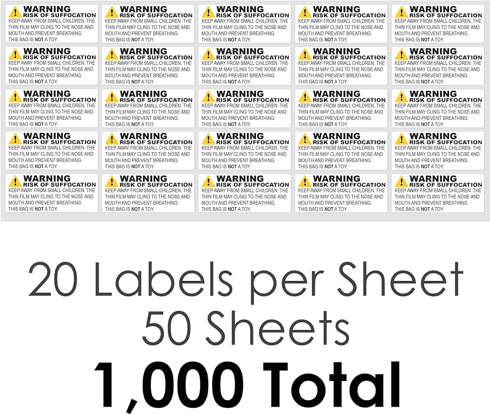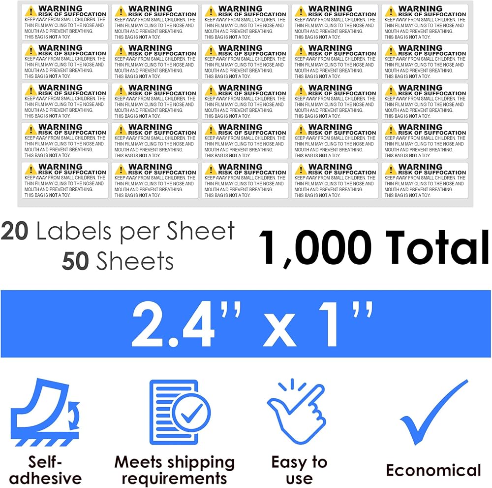 Economical: Each sheet has 20 pcs and comes with 50 sheets, a total of 1,000 labels. Sold in bulk to provide the best value to our customers. Designed for hand application. Ship and pack in confidence knowing you are providing warnings to keep small children away from your package.