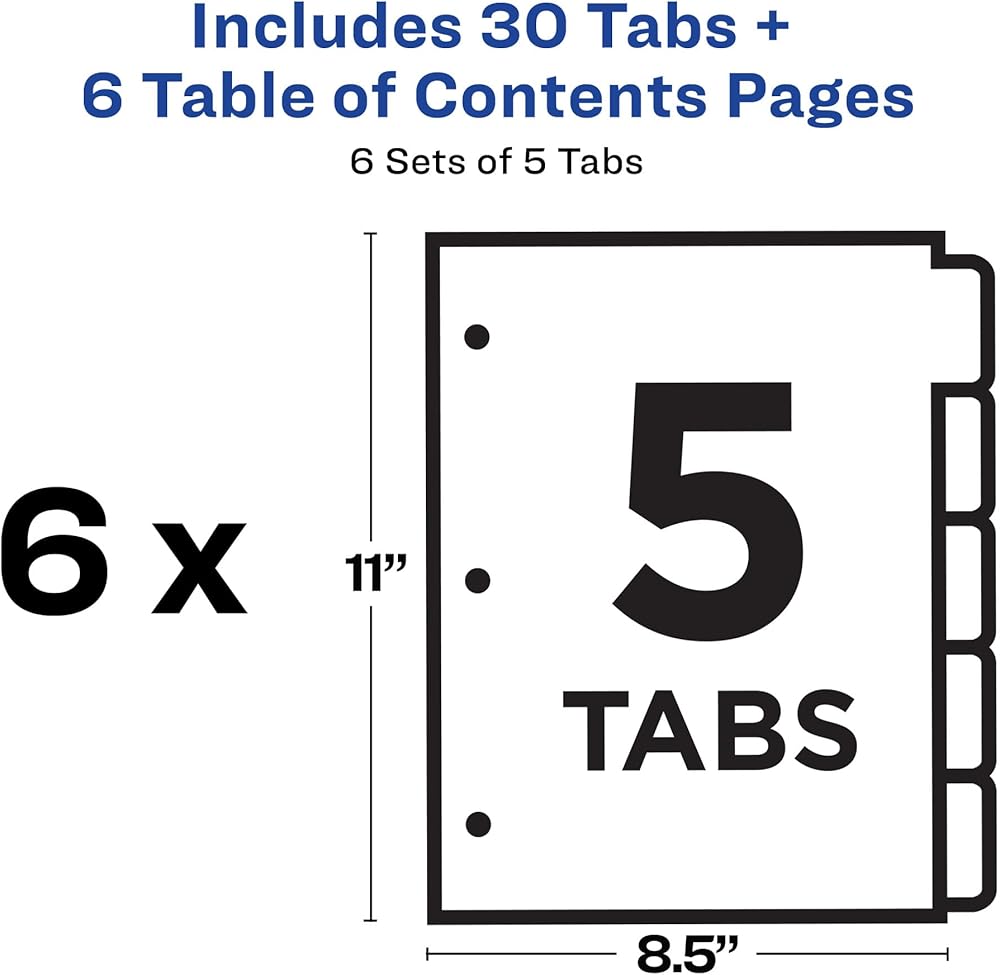 Organize your projects in seconds with these 3 sets of Avery Ready Index 5 Tab Dividers. Each white tab is preprinted to present a professional look. Print customized section titles and images onto the table of contents sheet without worrying about inserts or labels. Whether you're hosting a meeting or creating binders for classes, these dividers are perfect for getting things sorted. 3 sets of 5 tabbed dividers are included with each sheet measuring 8-1/2”x11”. The 3 ring binder holes are reinforced on both sides of the heavyweight sheet to prevent tearing. Each tabbed divider also includes additional reinforcement along the edge of the sheet to distribute stress and resist creasing. The table of contents sheet is also compatible with both laser and inkjet printers. This sheet can be printed in either portrait or landscape so that projects can be organized in any orientation. Just flip the sheet over to view the other layout. Check out the free templates for these dividers and try out the Avery Design & Print software today on the Avery sites